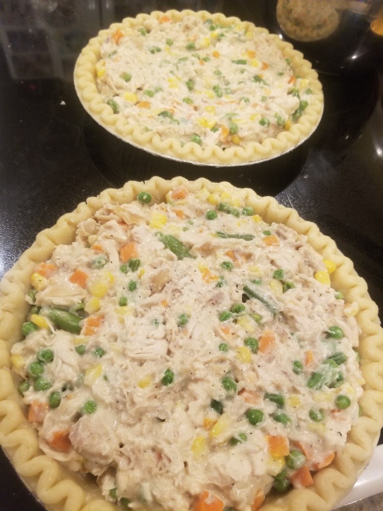 My dad loves chicken pot pies and I try to make them every few months. The way I make them I always get 2 out of my recipe. You can cut the recipe in half if you only want 1…but I like to make 2, one for the day they are baked and one for later in the week or for the freezer. It is really nice to have meals ready and in the freezer…quick dinners on busy days of work here at home.