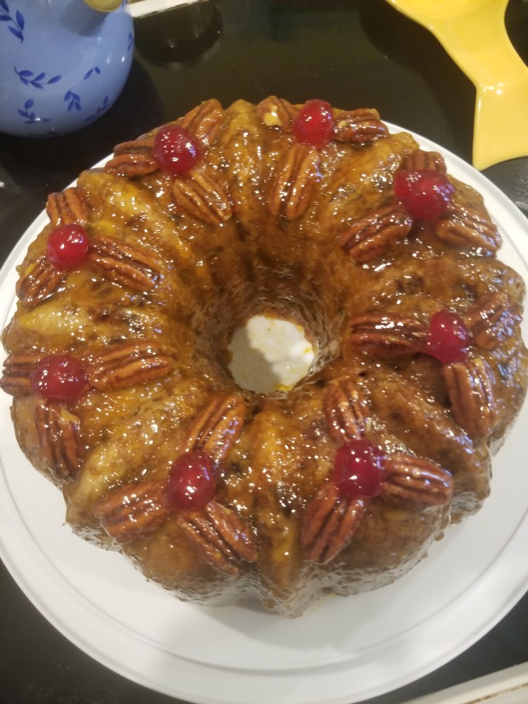 Now you let the cake sit to dry the glaze. This cake lasts for weeks and weeks . It gets better as it sits. I use a plastic cake keeper.