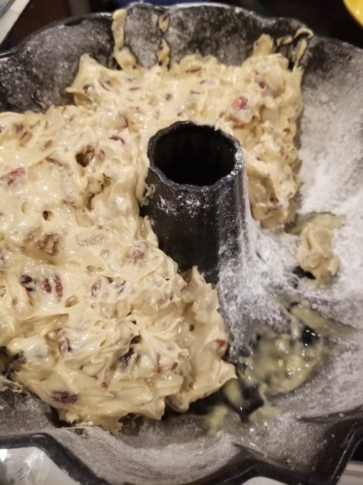 Now mix the cake batter into the fruit and pecans. It will be very thick.