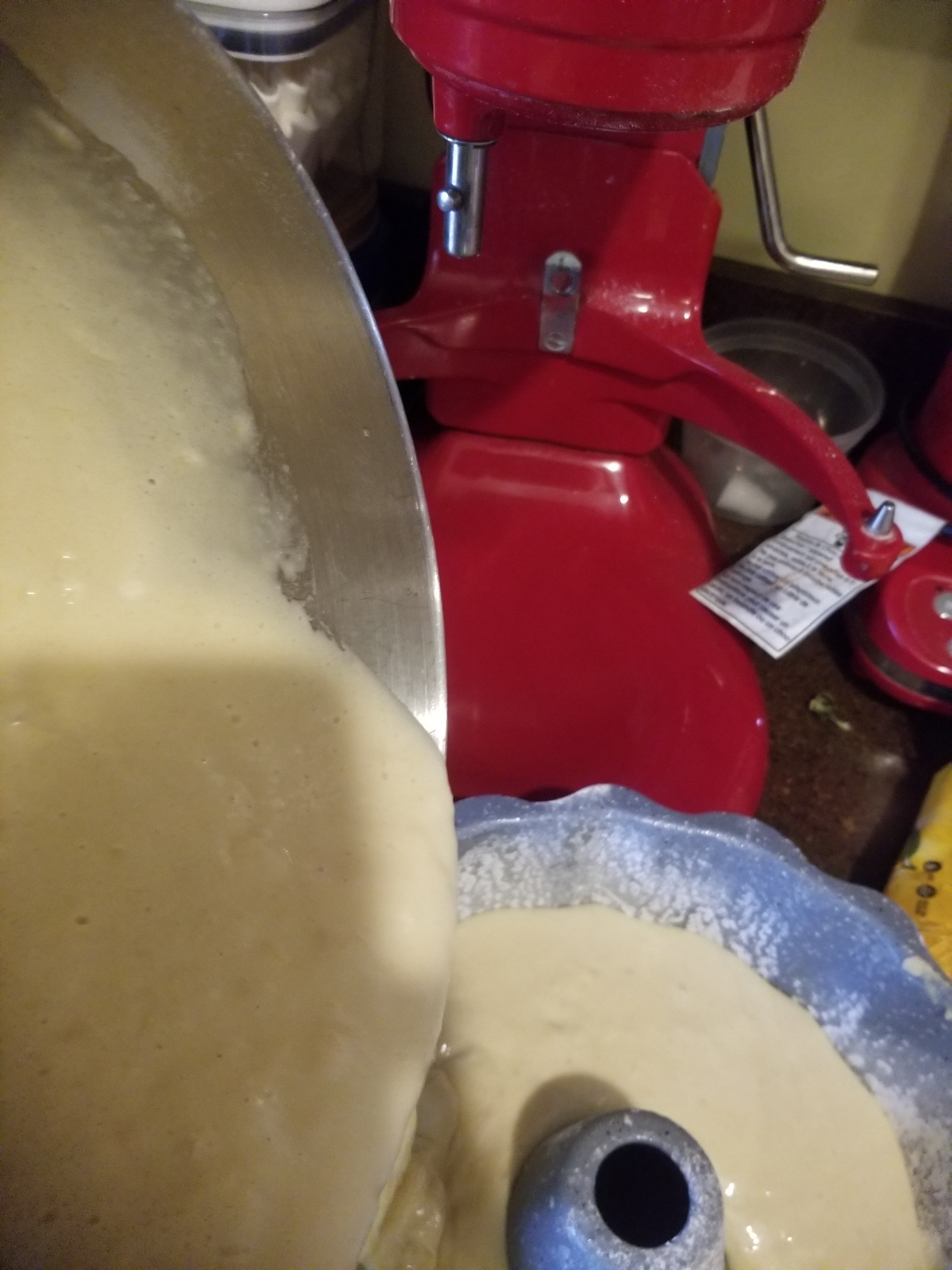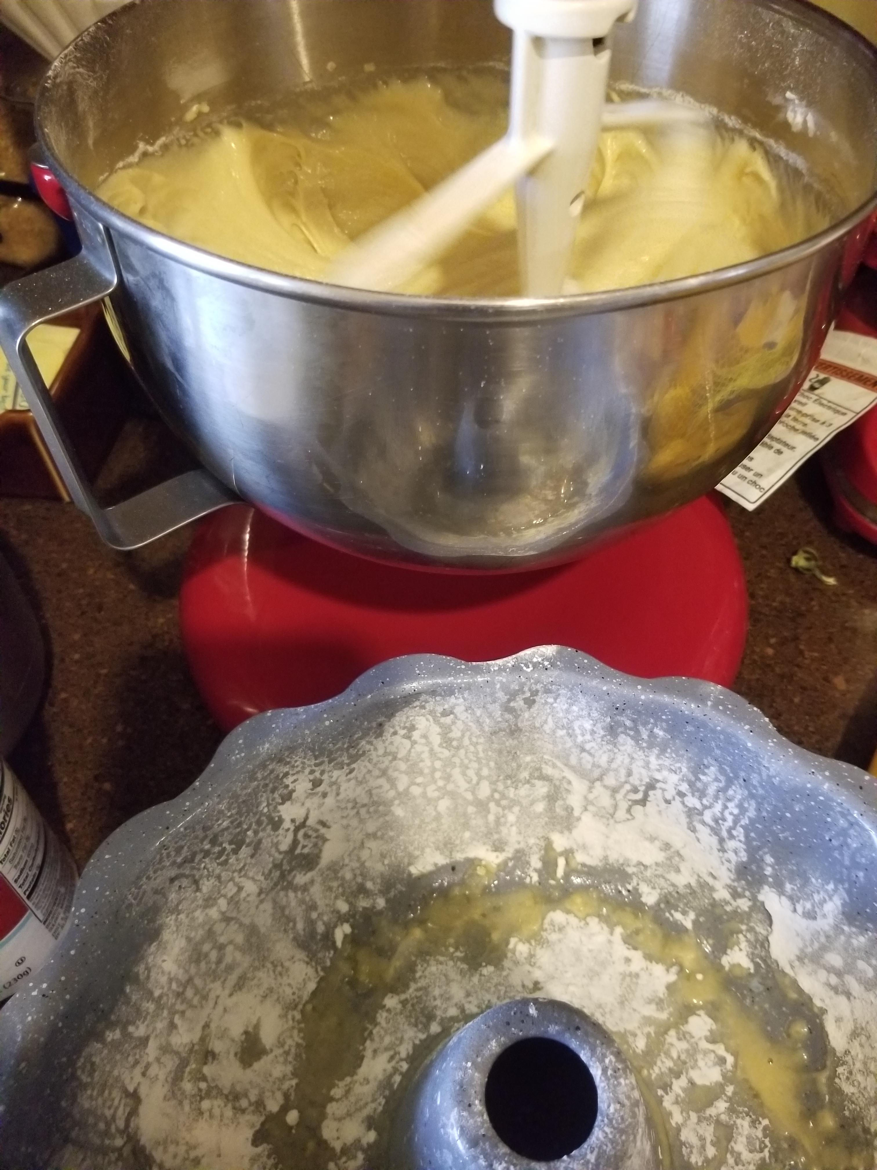 prepare your bundt cake pan by spraying it well and coating with flour.pour your batter into the pan, now bake at 350 for 1 hour, check and see how it is baking, then bake for the additional time necessary at 10 minute increments.