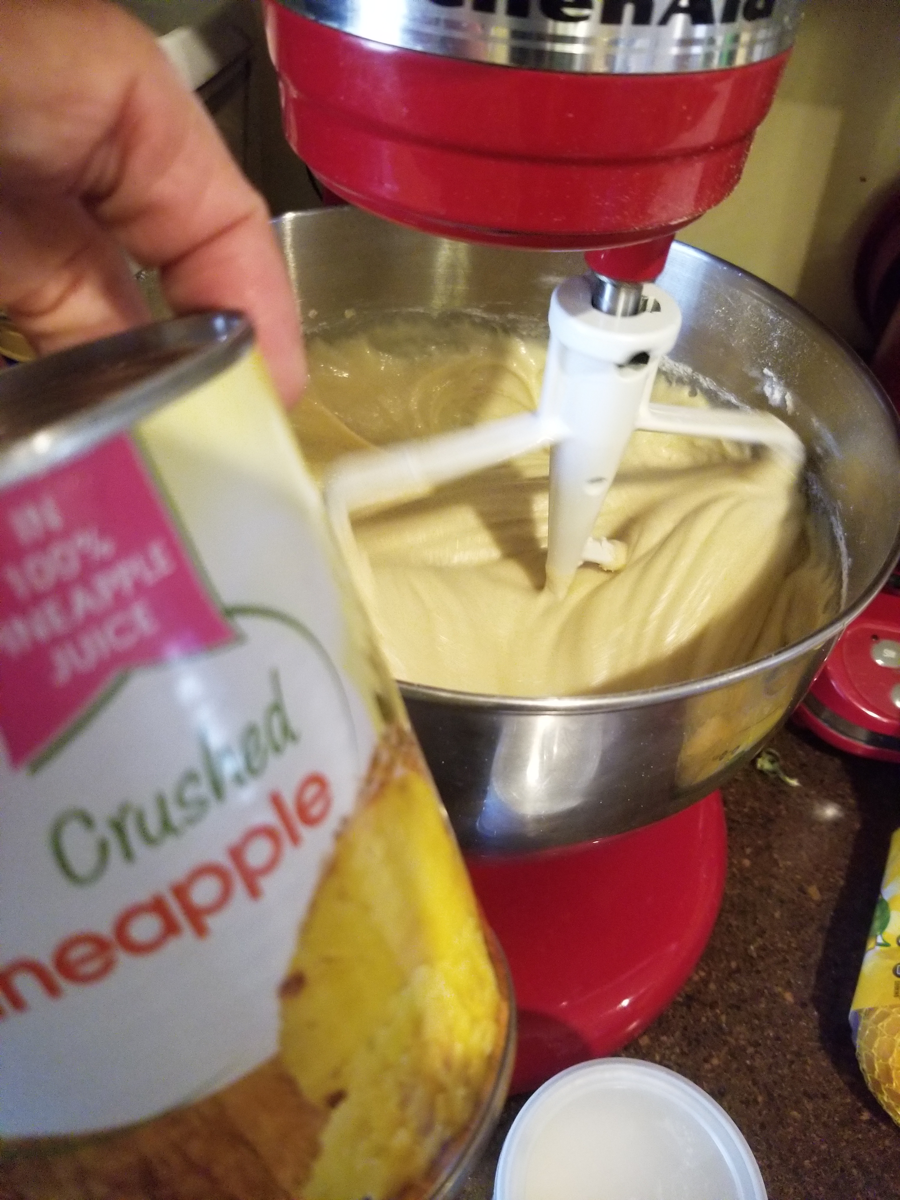after mixing, add flour ,baking powder,salt,crushed pineapple and vanilla.