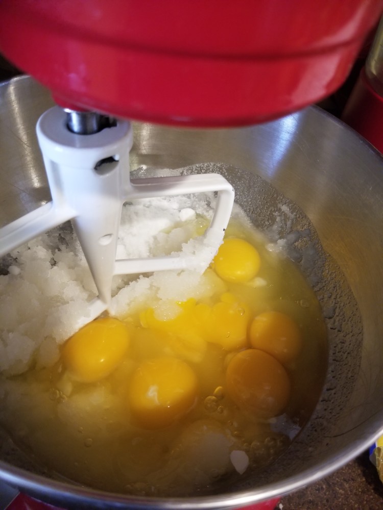 place oil, sugar and eggs into your large mixer bowl. with the paddle attachment, whip till somewhat thickened.