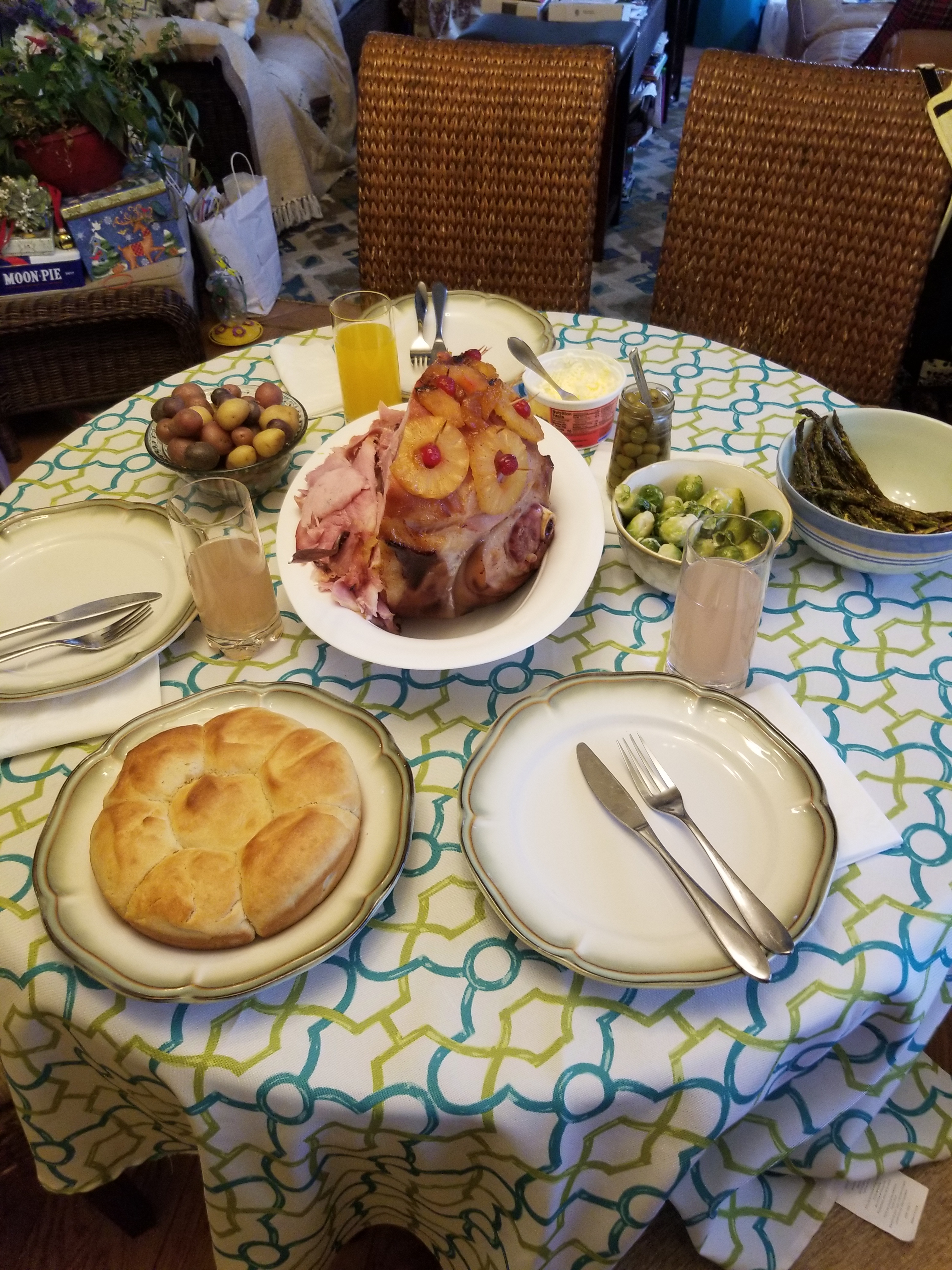 Delicious pineapple glazed ham, roasted asparagus, new red and white potatoes, roasted Brussel sprouts and homemade potato rolls!