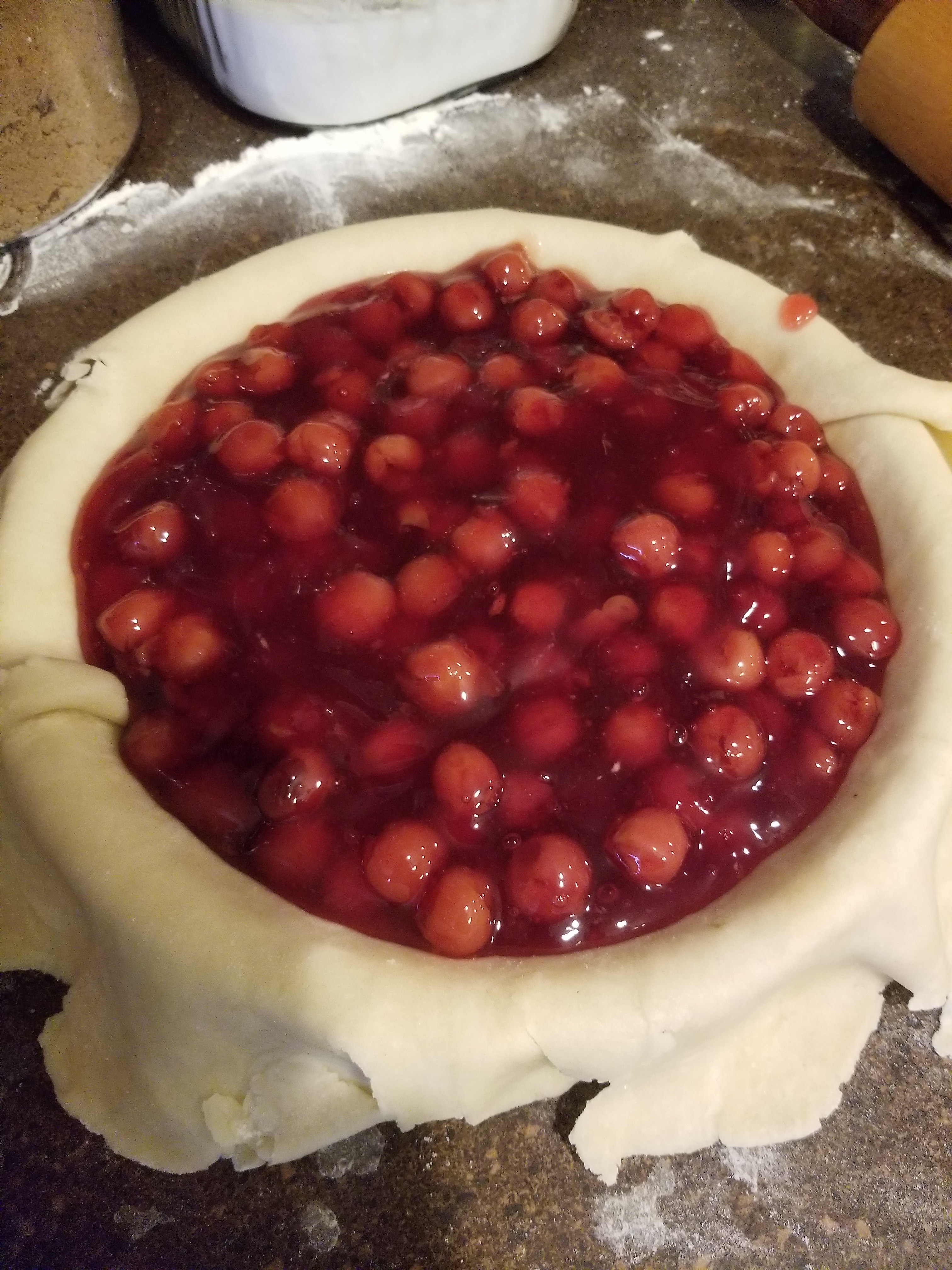 Now stir all your filling ingredients together. If the cherries are extra juicy, add 2 more tablespoons of corn starch. Now is time to fill your pie shell!