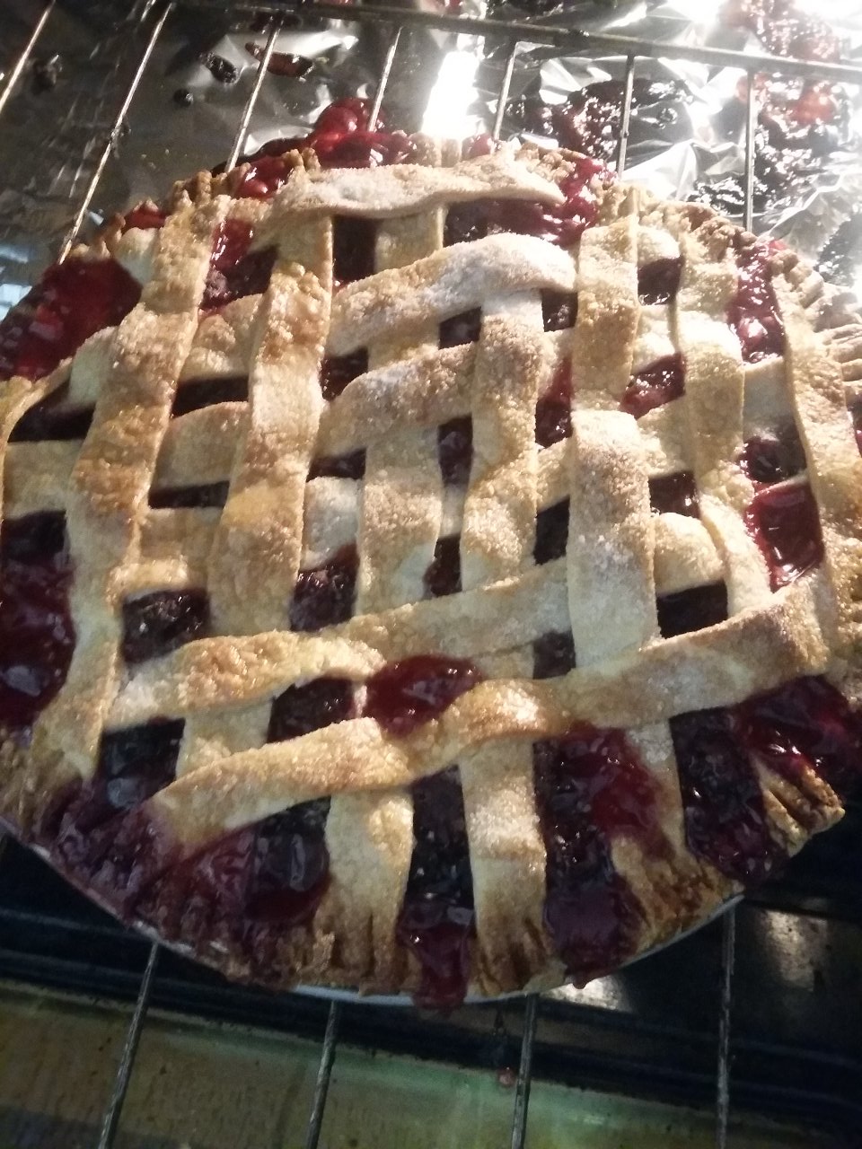 This filling made one large pie and one small 4 inch pie as well. Now bake the pies at 375* for about 45 minutes or so. I always put a parchment lined sheet pan under the pies to catch all the drips.