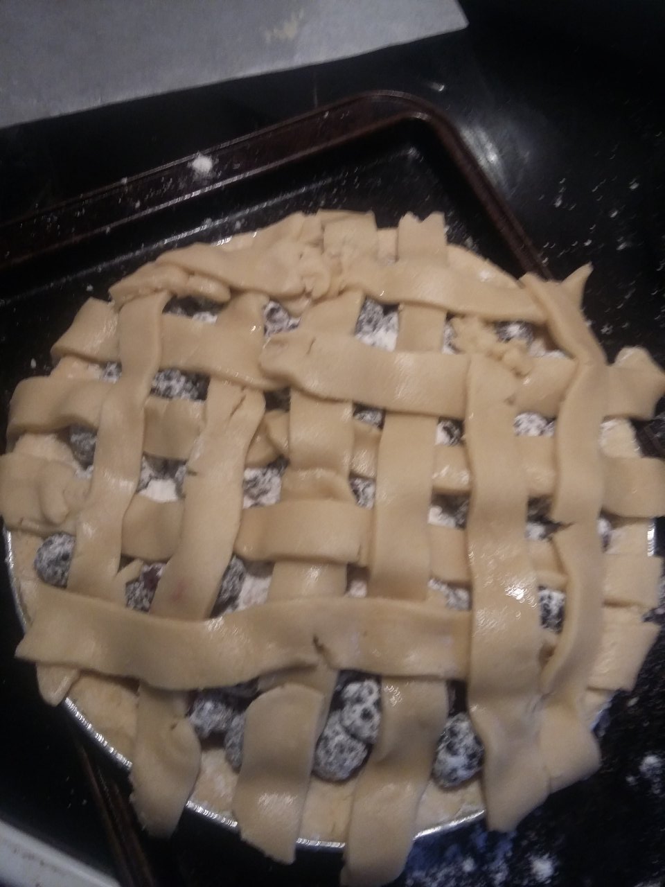 Now combine the blackberries with the sugar and flour. Now place the berry mixture into the prepared crust. Now make the lattice crust. After the lattice is in place, trim the edges, then brush the crust with cream and sprinkle it with sugar.