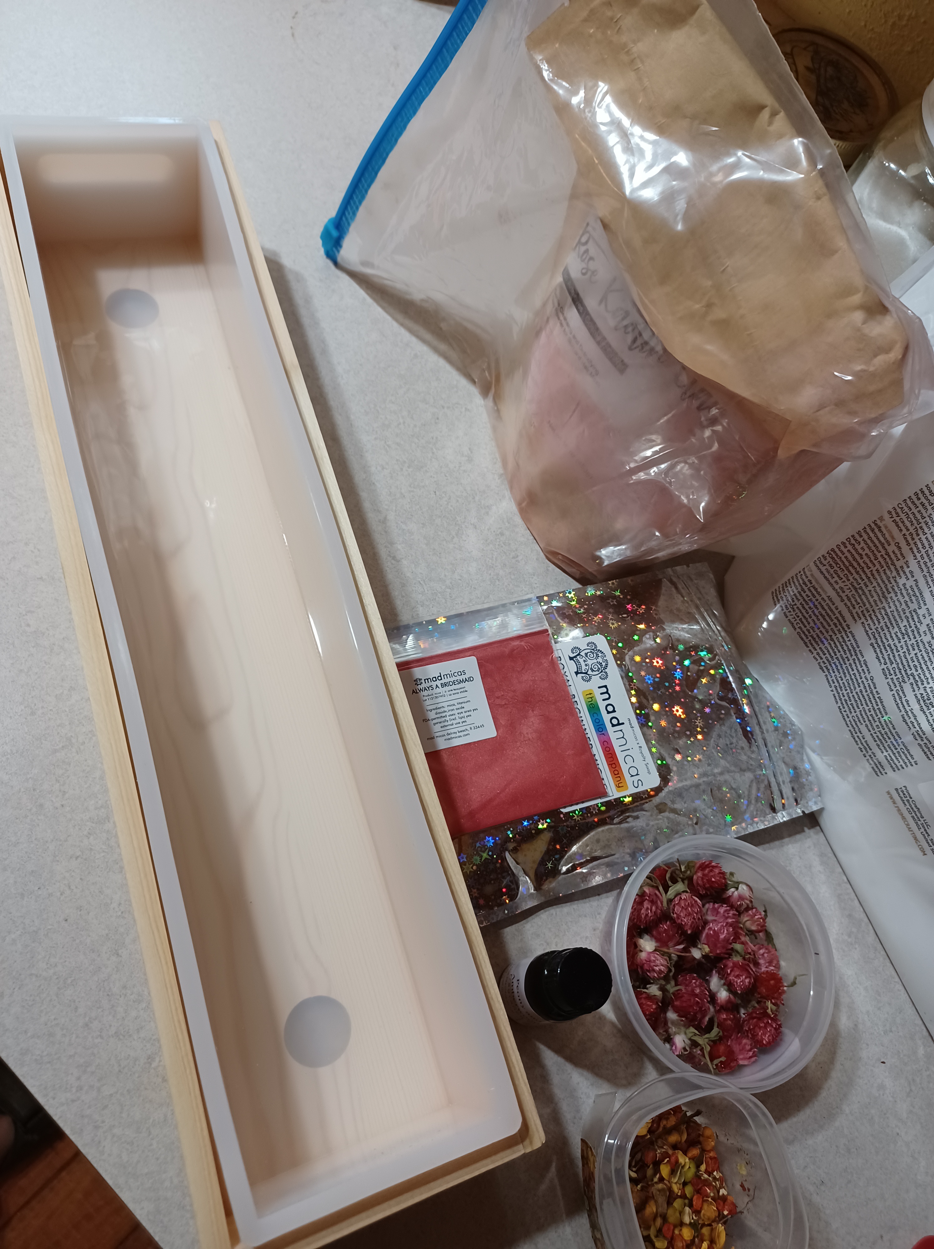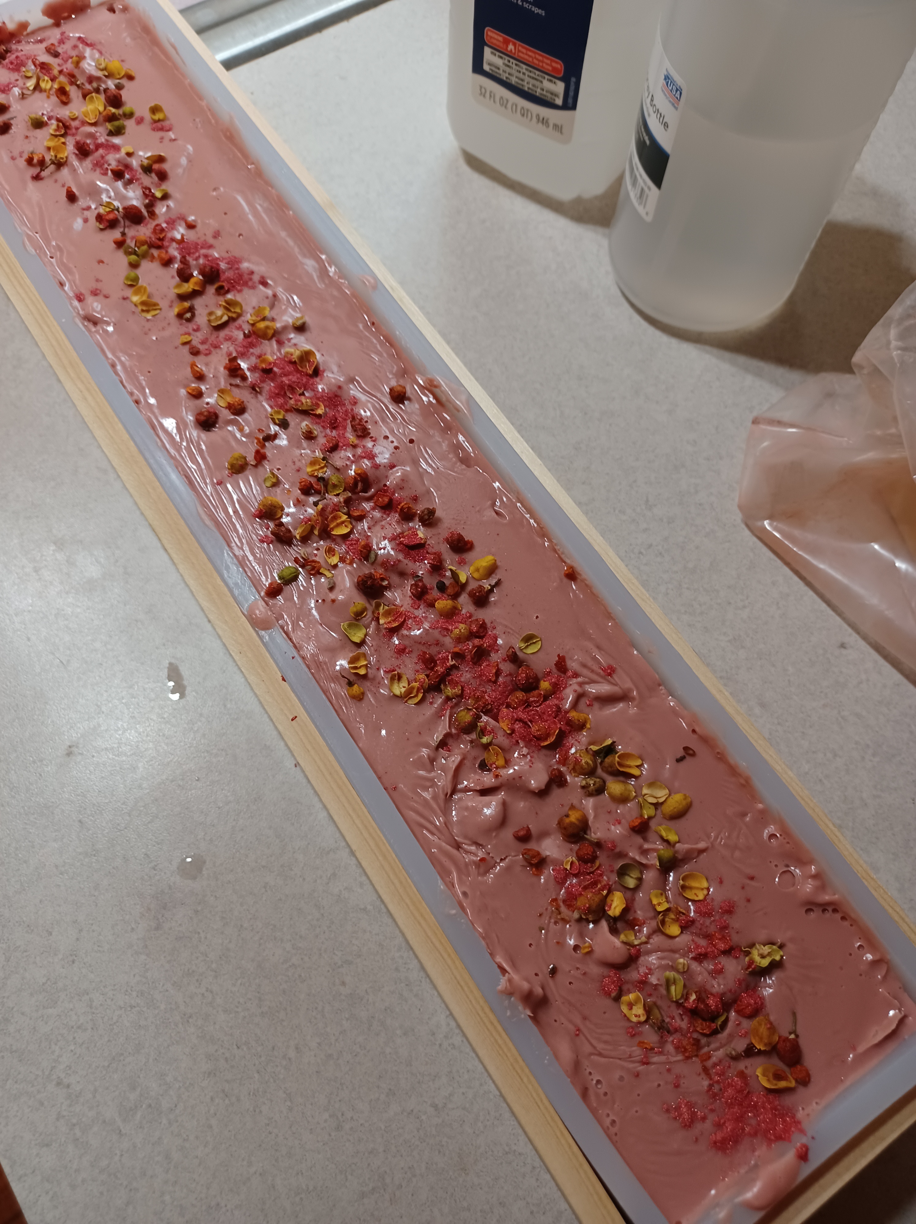 I used a stick blender to mix in the mica and the fragrance…then poured the soap into a 5 pound mold box. When I poured it into the box, I then sprinkled a mixture of botanicals on top, as well as a sprinkling of mica. This soap only has to sit for 4 or 5 hours, then it was ready to unmold and cut. It made a really nice soap! I have already made another batch of traditional cold process soap which I will post soon.