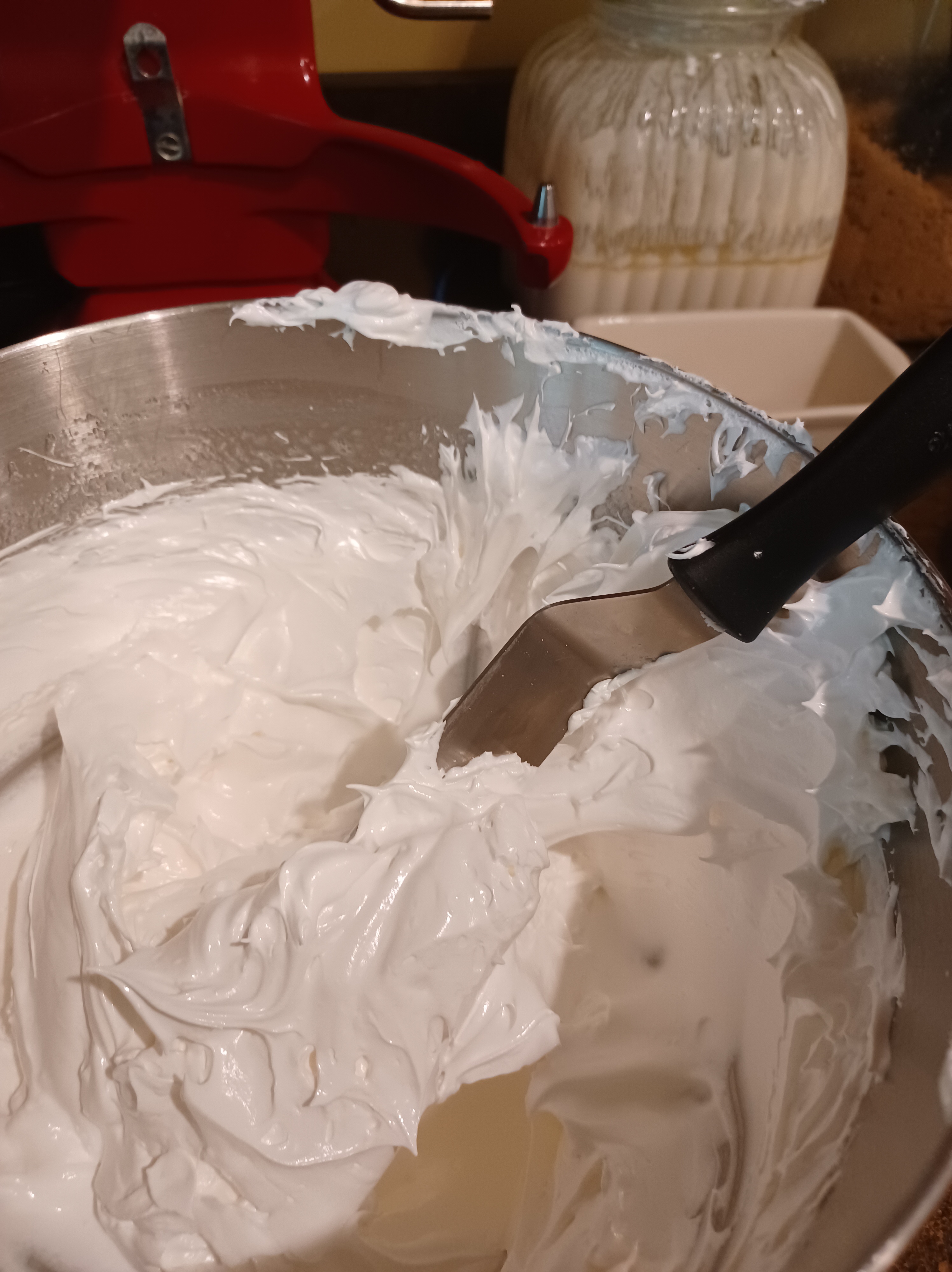 Move the mixer bowl to the mixer, add the vanilla. Put the whisk on the mixer, slowly move the speed to high and let it go till it gets fluffy and glossy.
