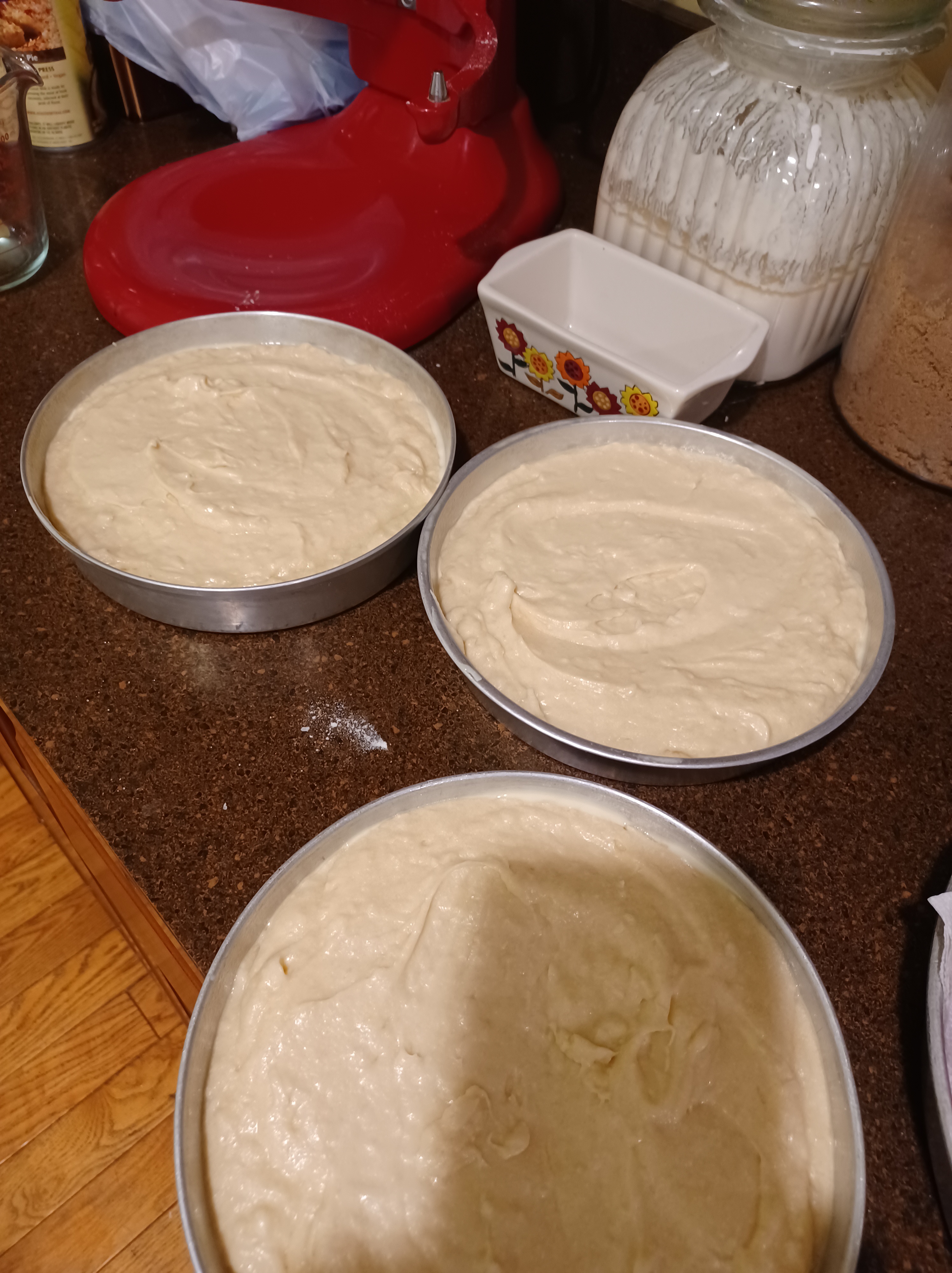 Turn your oven to 350* prepare 3 8-inch pans. Spray or grease then sprinkle with flour. set aside.