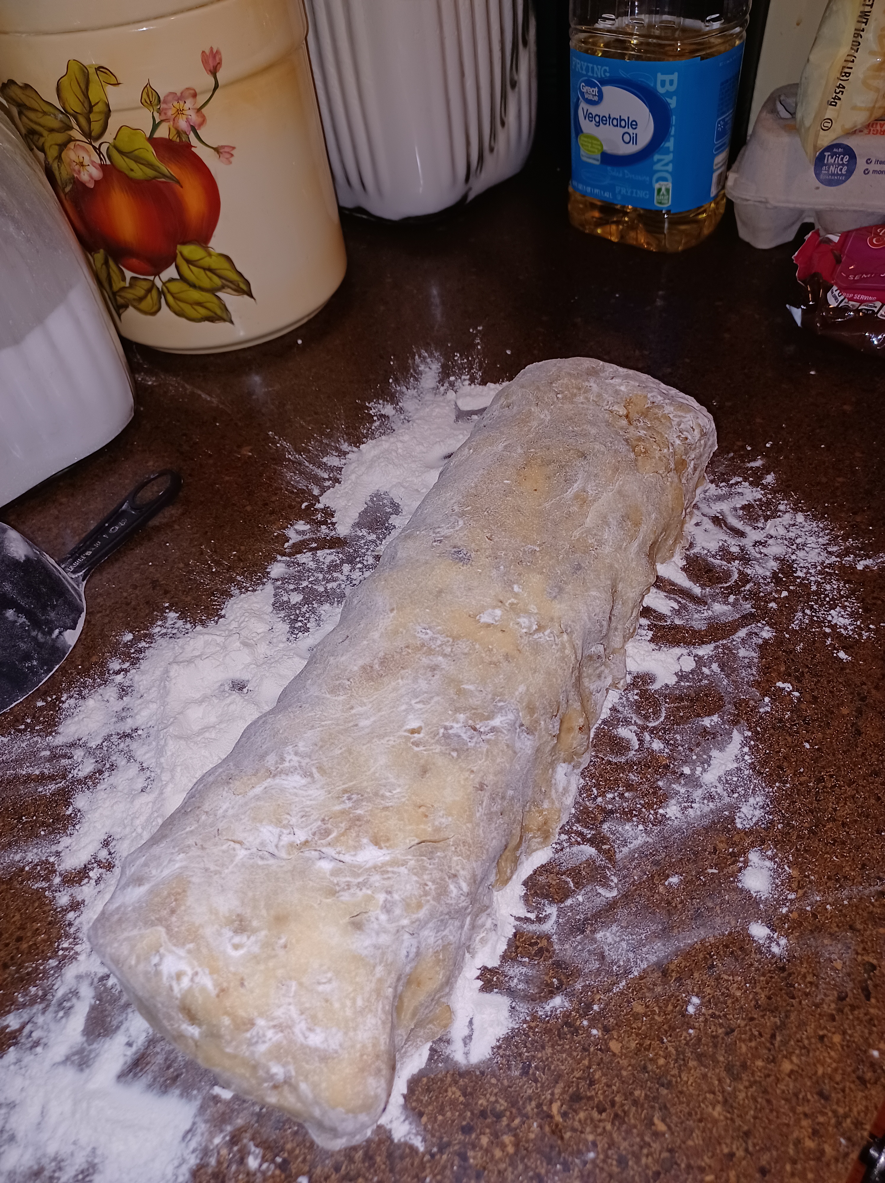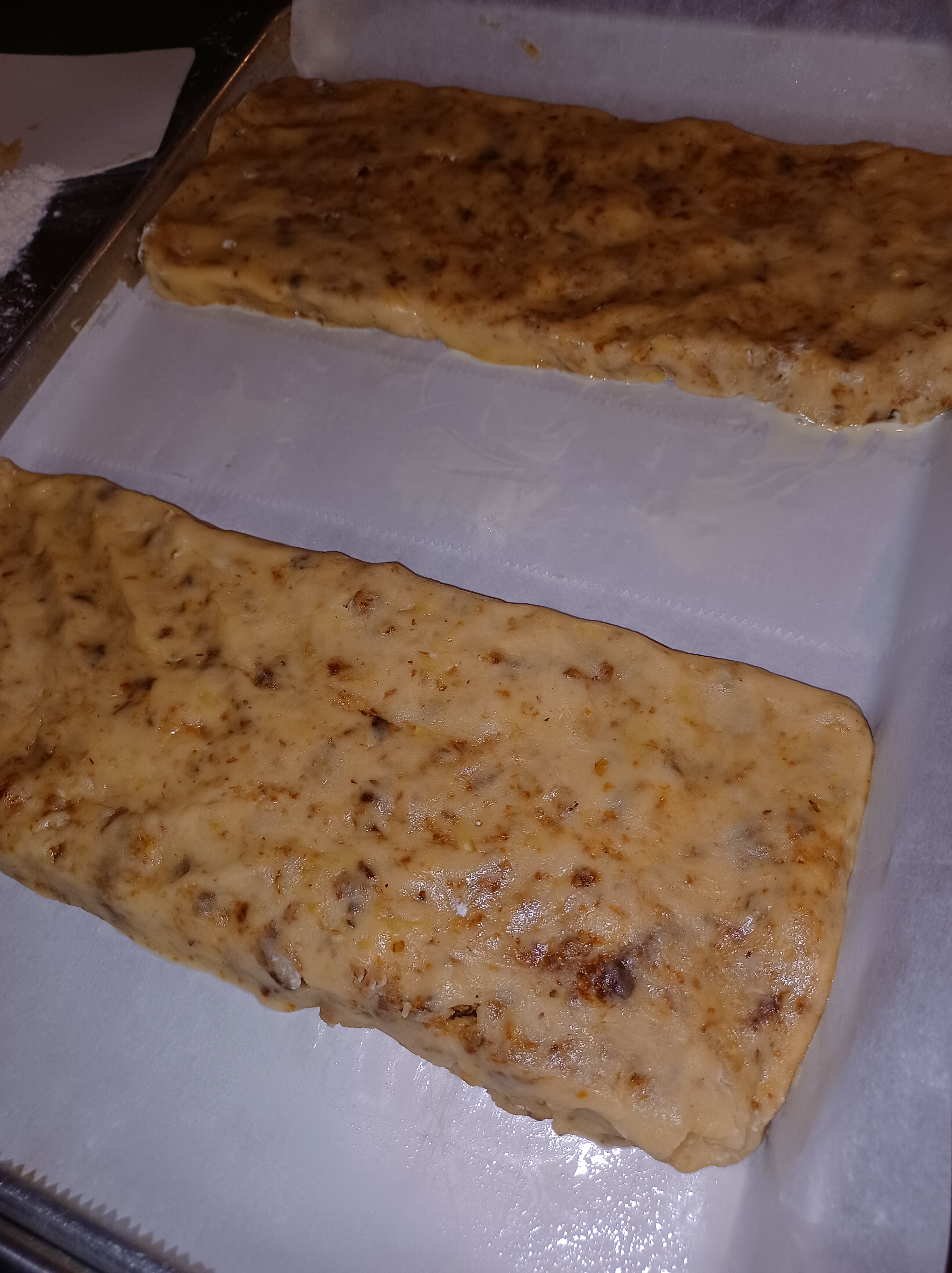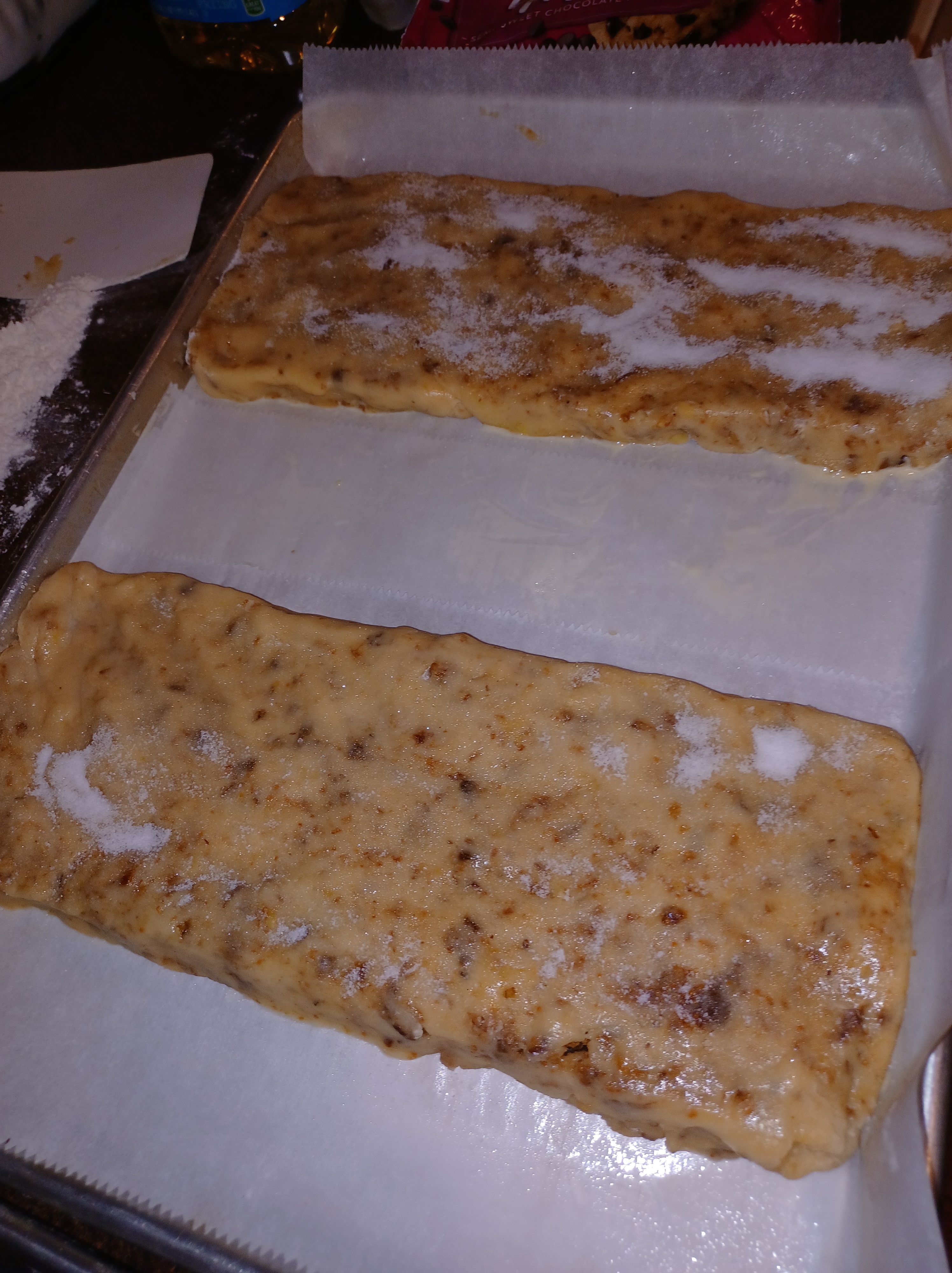 The first picture is your blob of dough, the second picture is the first log, shape it, then cut it into 3 sections. The third and fourth photos is the divided sections, placed on a parchment lined aluminum sheet pan. I always do it this way. It is the best way for a consistent product.
