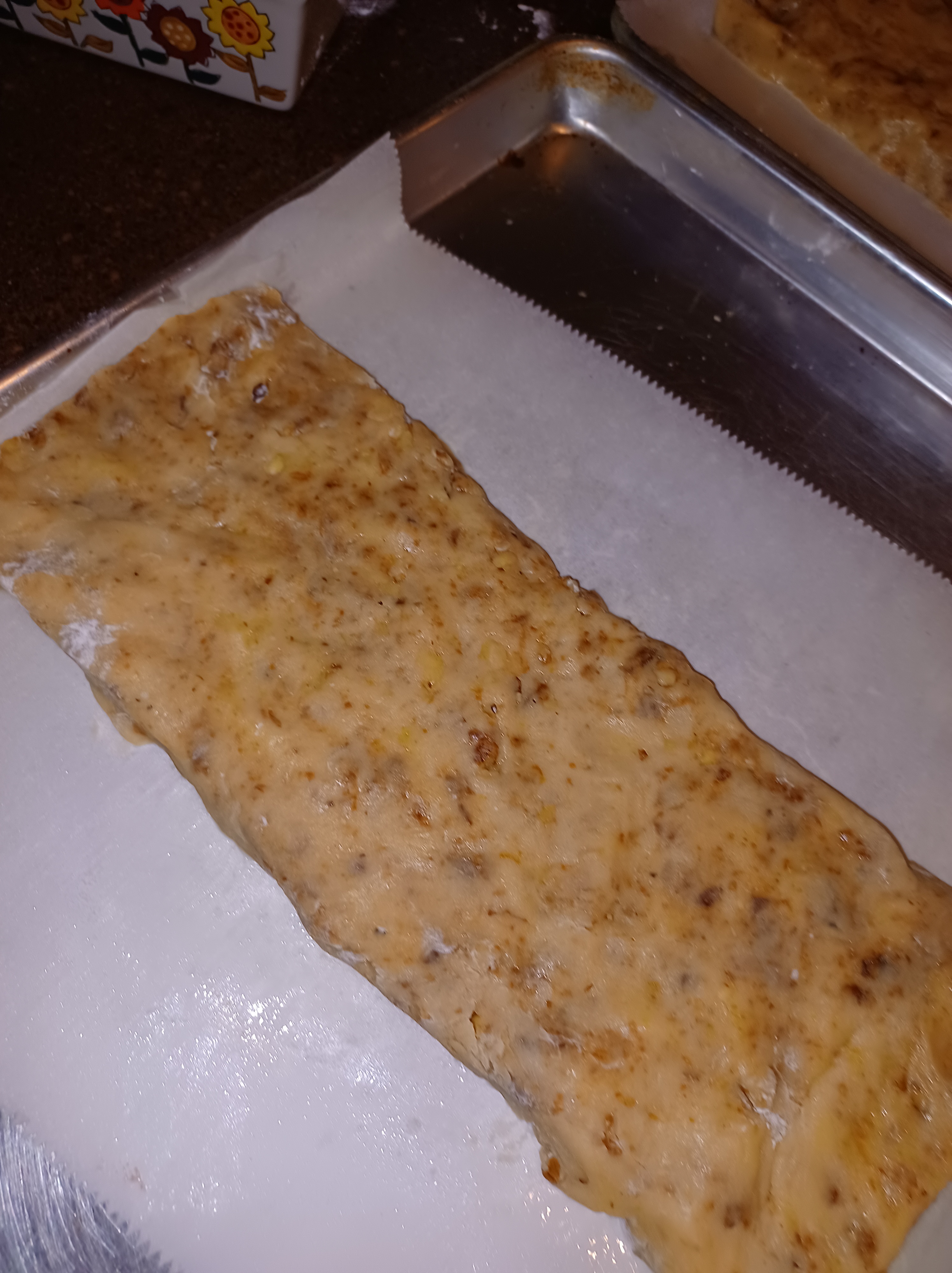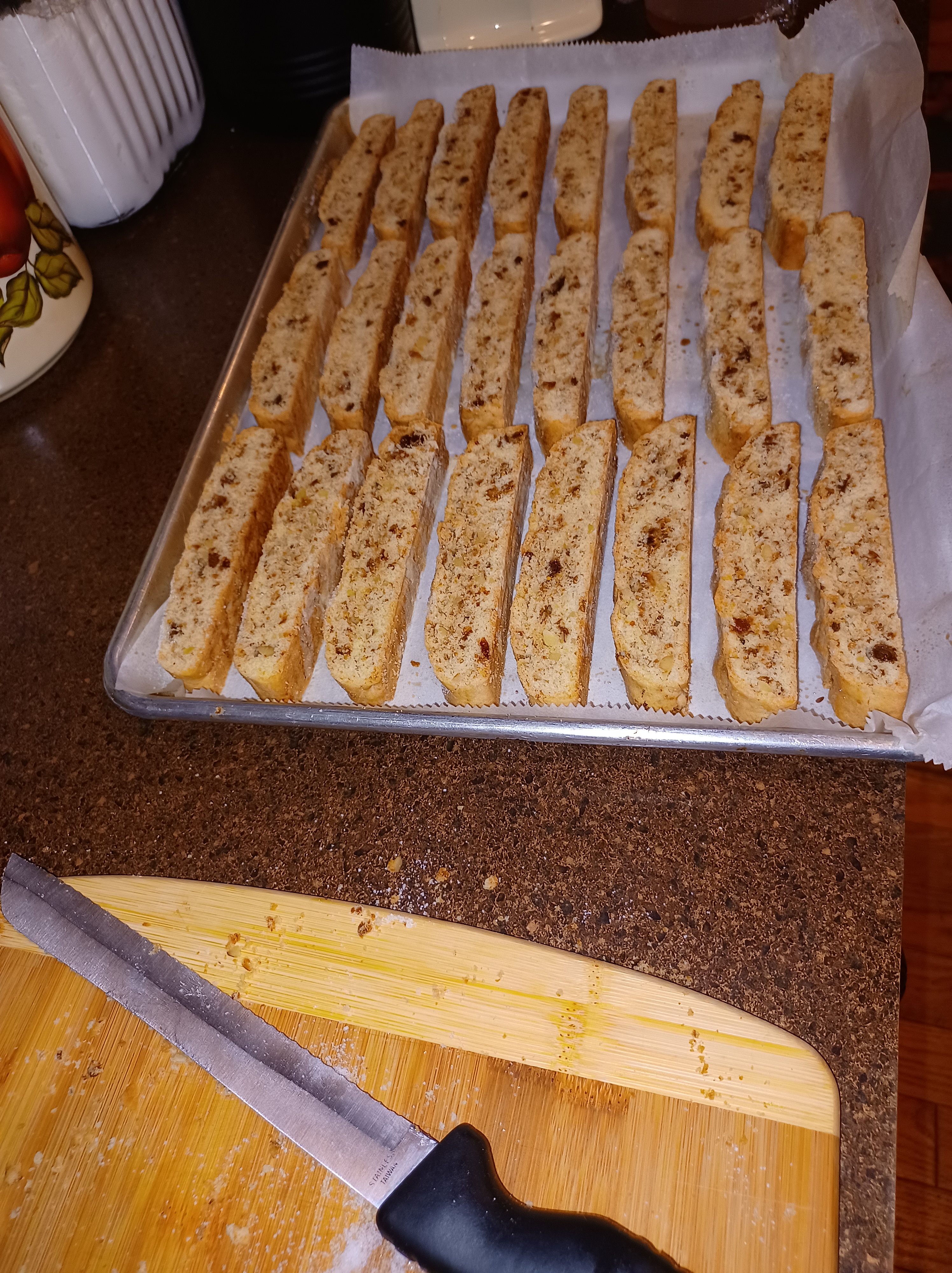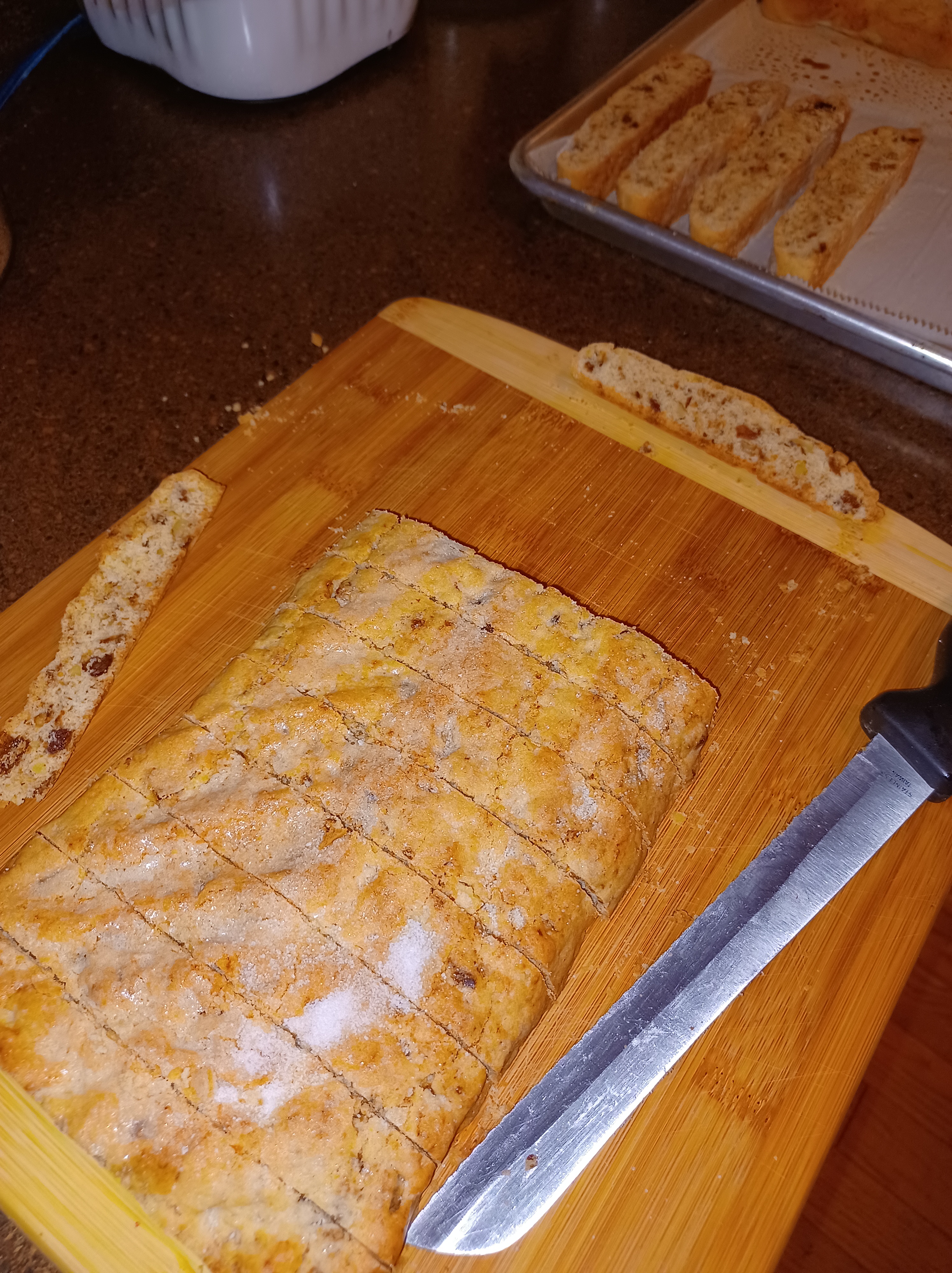 Carefully place the baked log onto a cutting board. Use a serrated knife to slice the biscotti. (a serrated knife is essential) Saw across the loaf, keeping your knife flat across the loaf, cut them about 1 inch wide. Carefully pick up each biscotti and place on your sheets. I use the same sheet for the second bake.