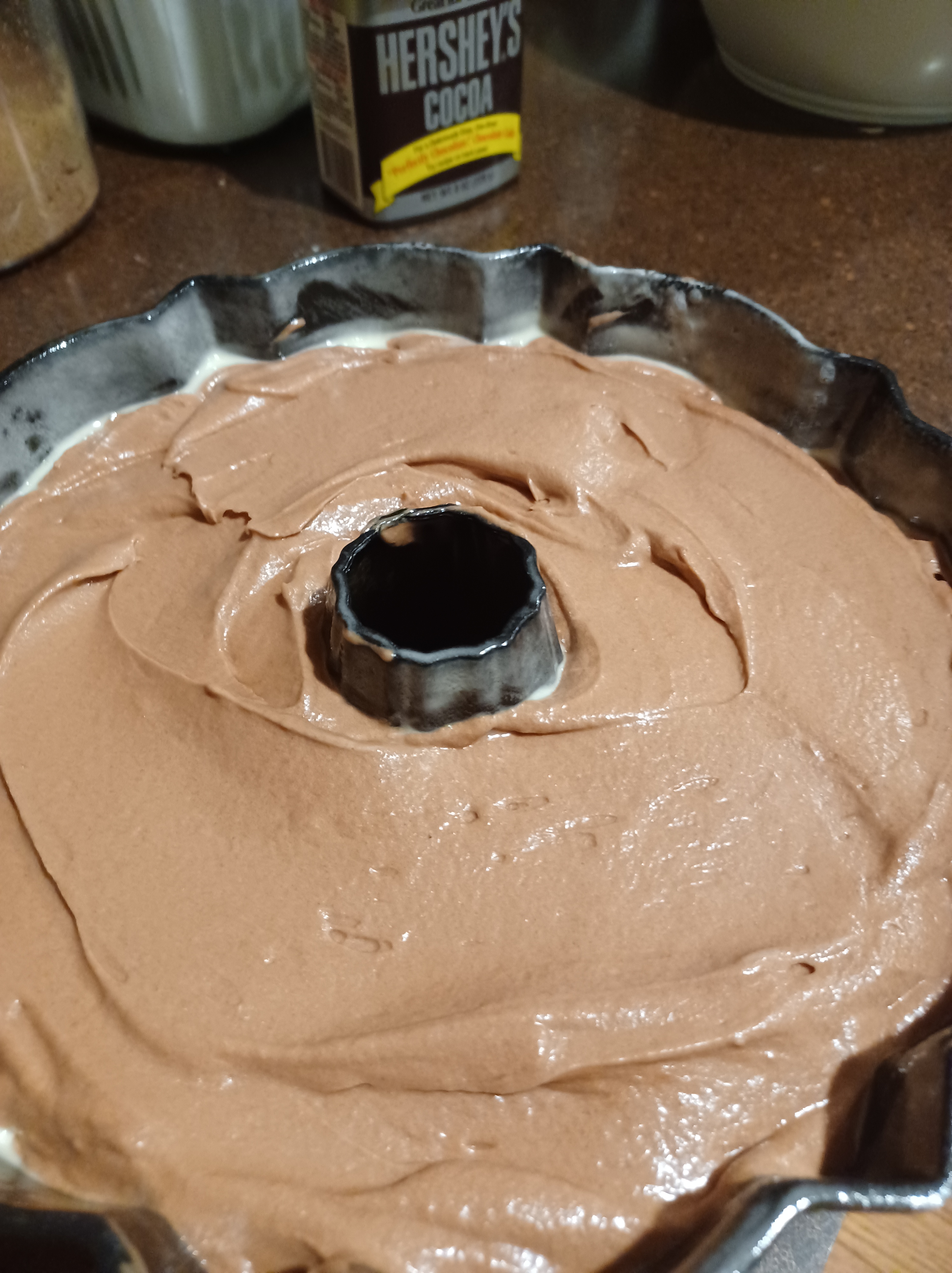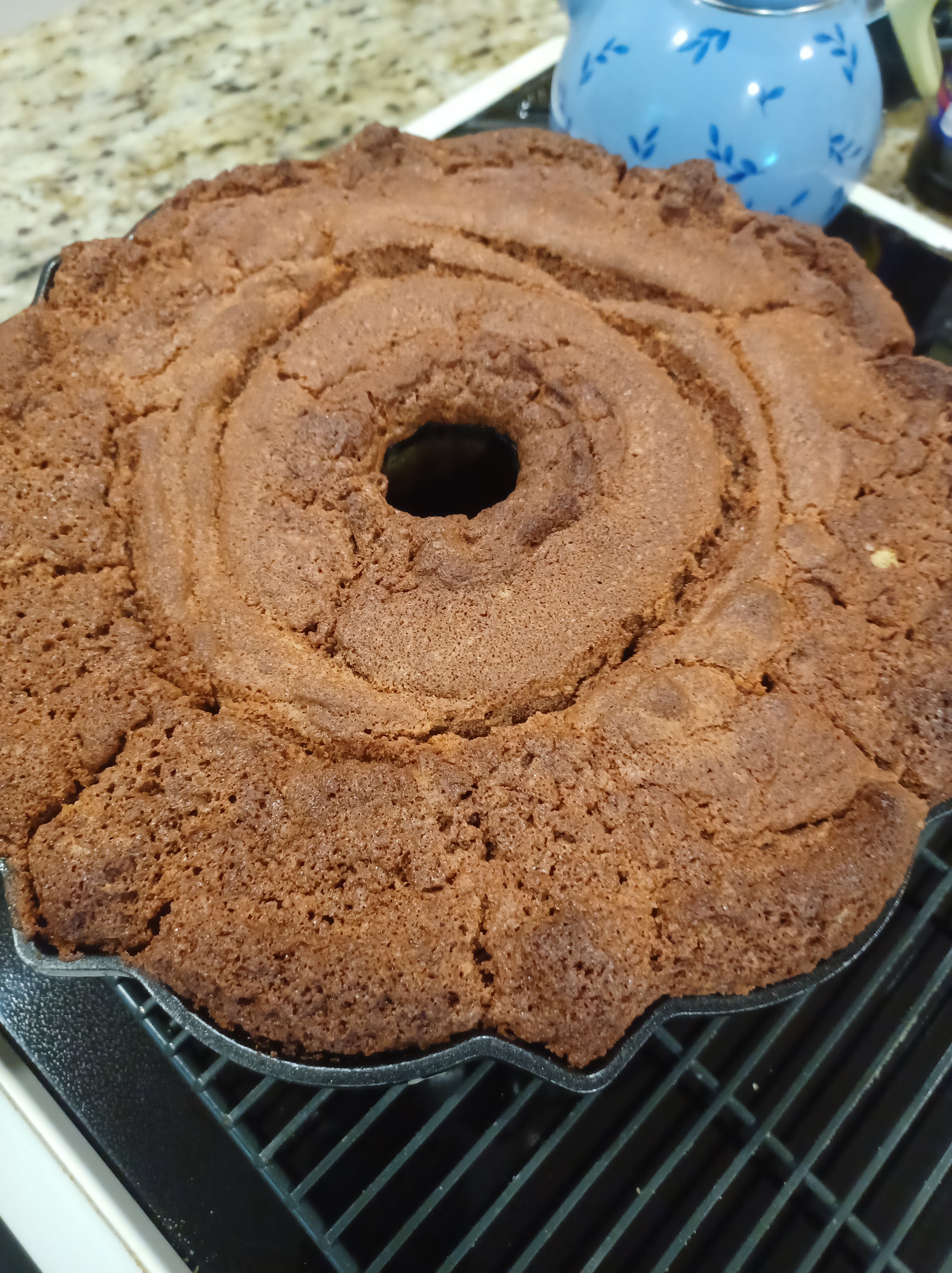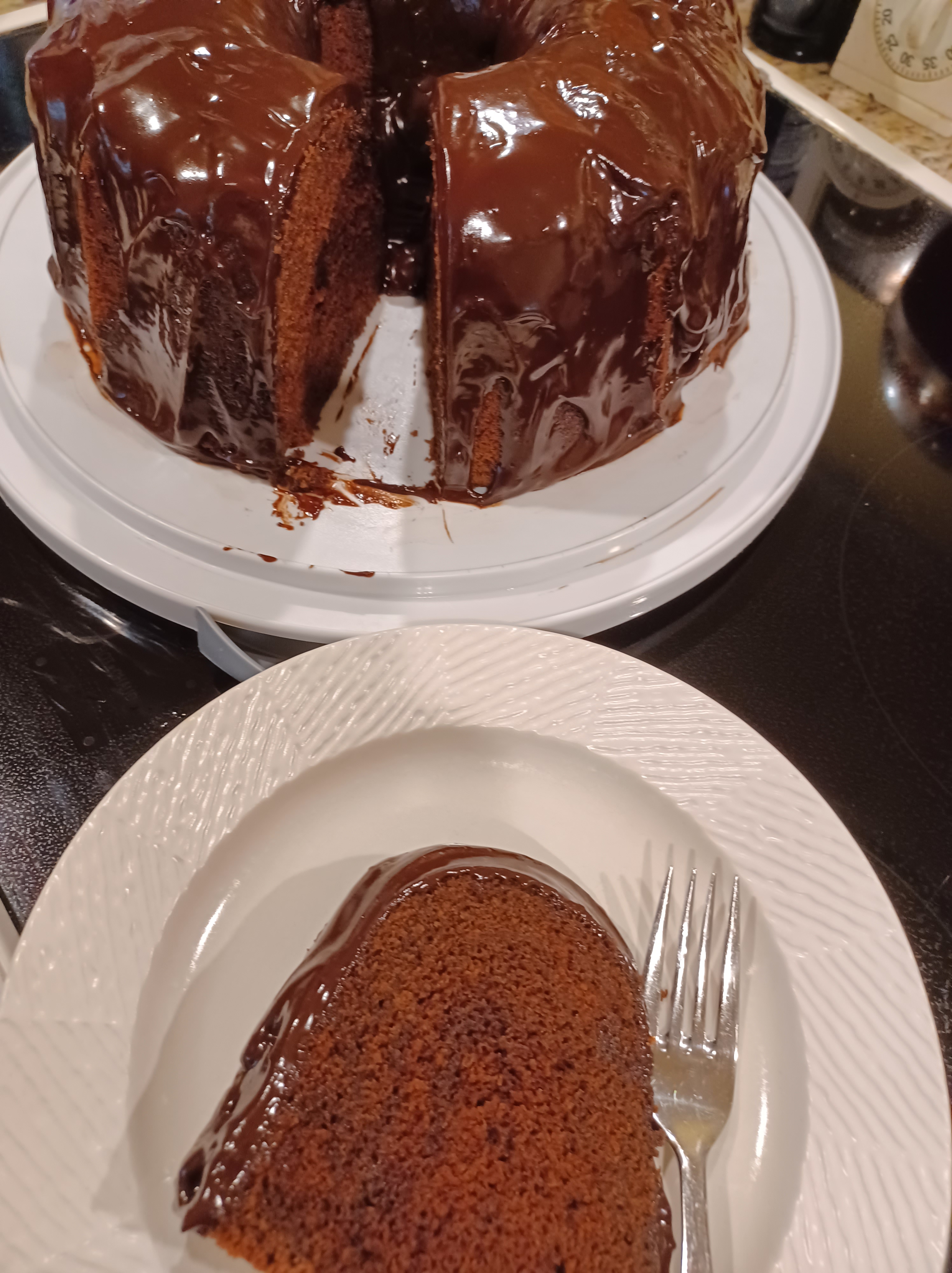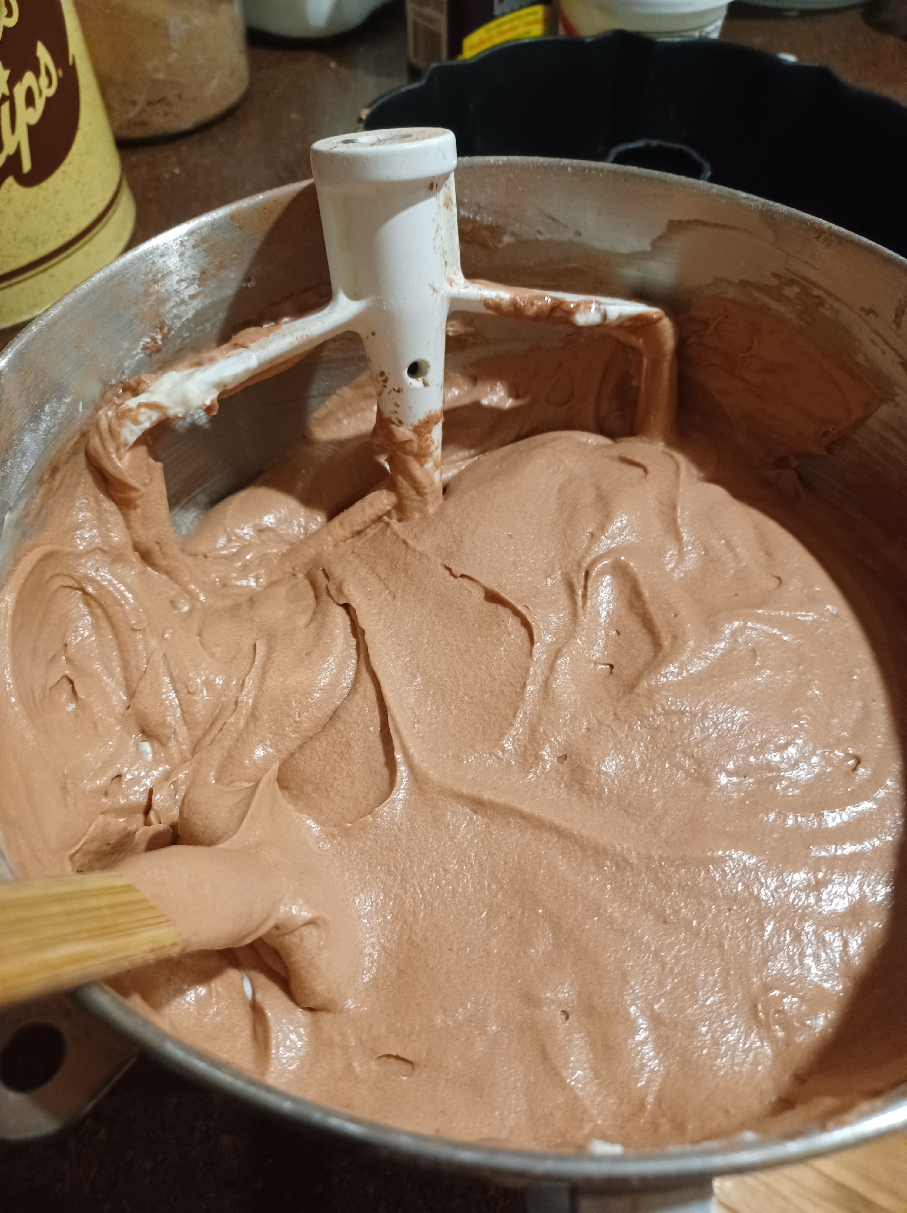 Now place your batter into your greased 12 cup bundt pan. Place into your preheated oven and bake for 1 hour, then check every 10 minutes till a skewer comes out clean. Remove the cake from oven and let cool till you can touch the pan, then turn the cake out onto your cake plate to finish cooling.