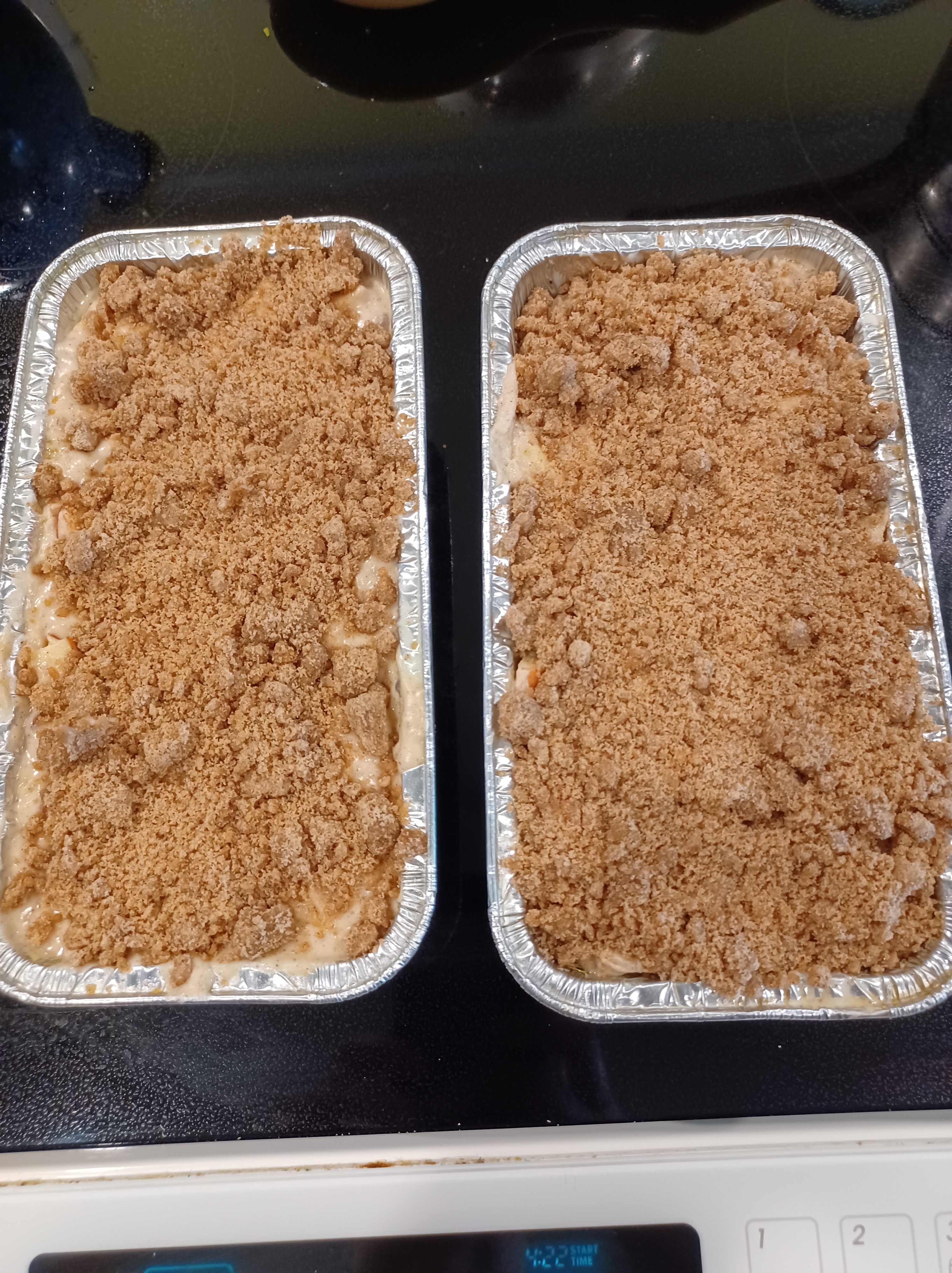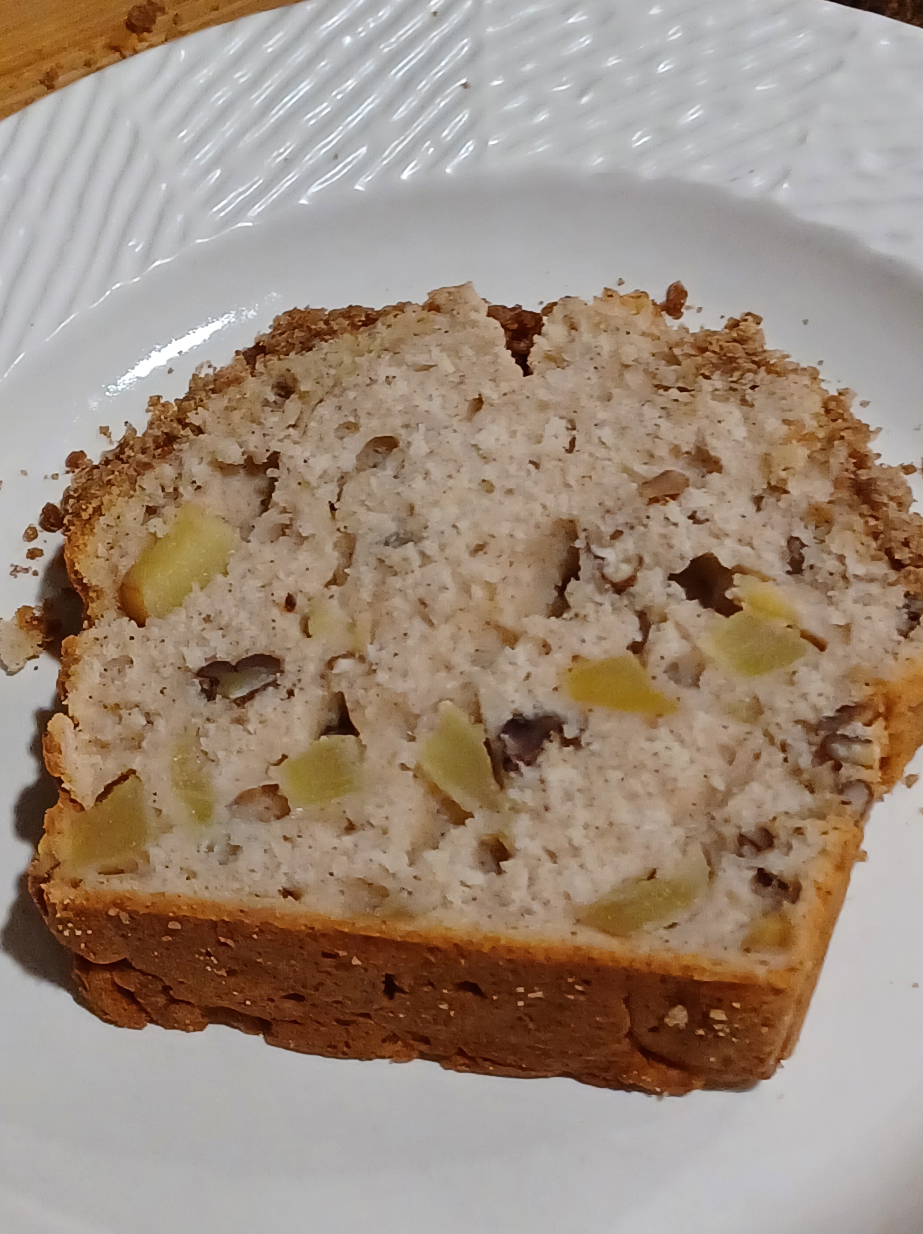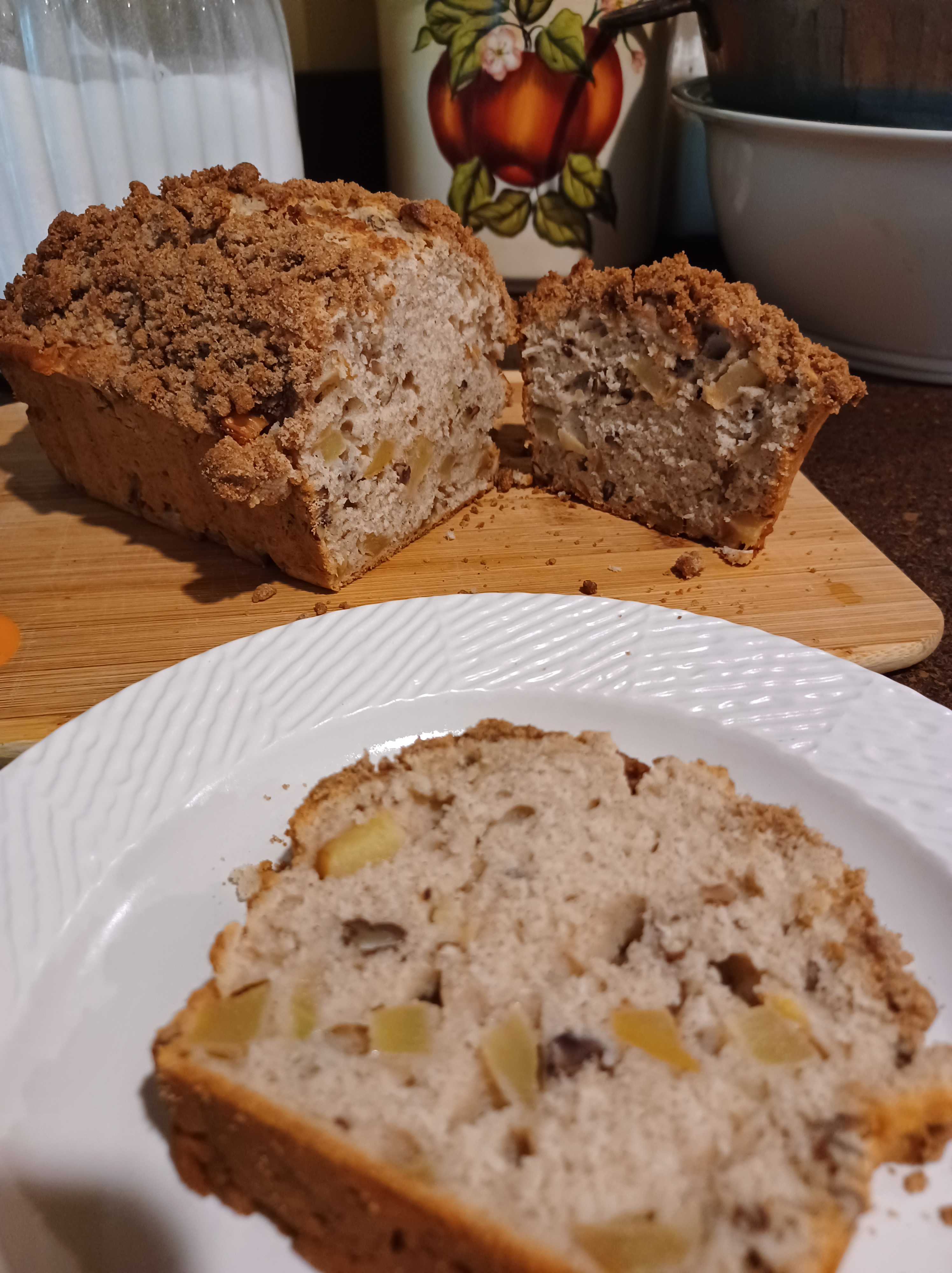 This is a good apple bread. It is full of chopped apples and pecans! The streusel really makes this bread special. It is good for snacking or toasted then smeared with butter or cream cheese for breakfast.
