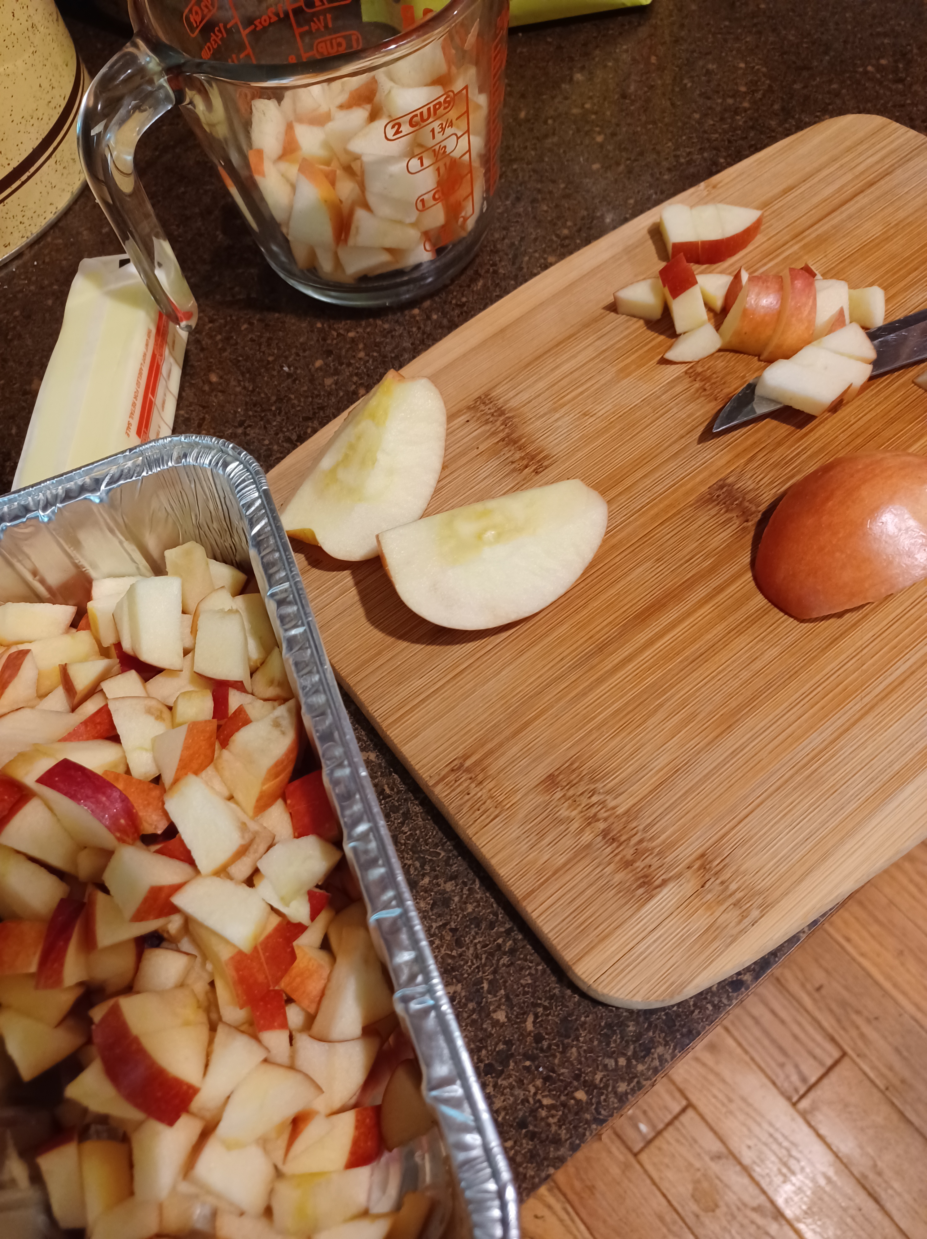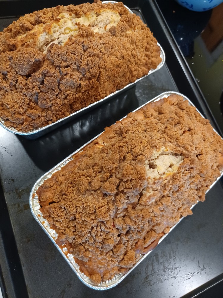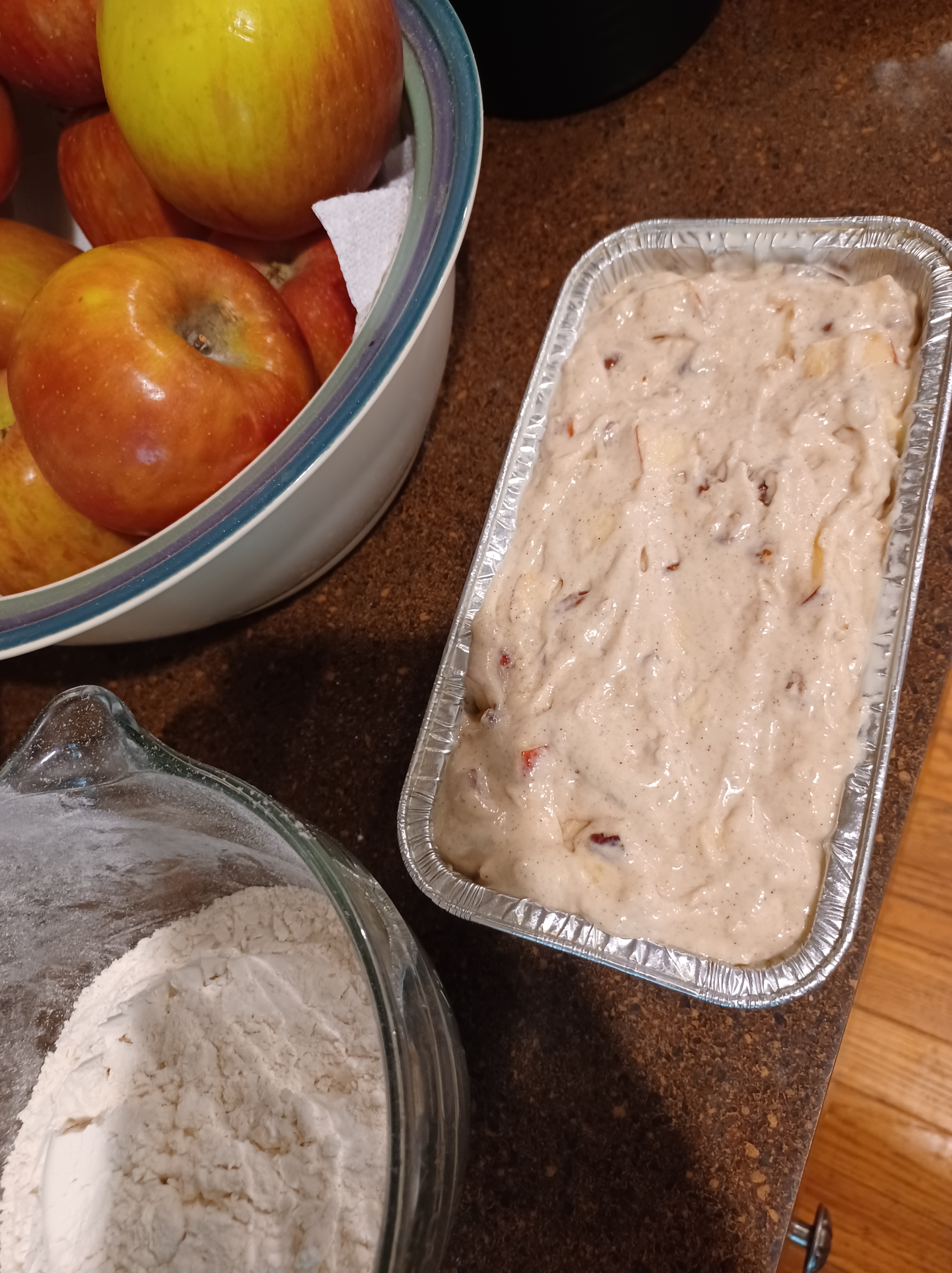 This is a good apple bread. It is full of chopped apples and pecans! The streusel really makes this bread special. It is good for snacking or toasted then smeared with butter or cream cheese for breakfast.