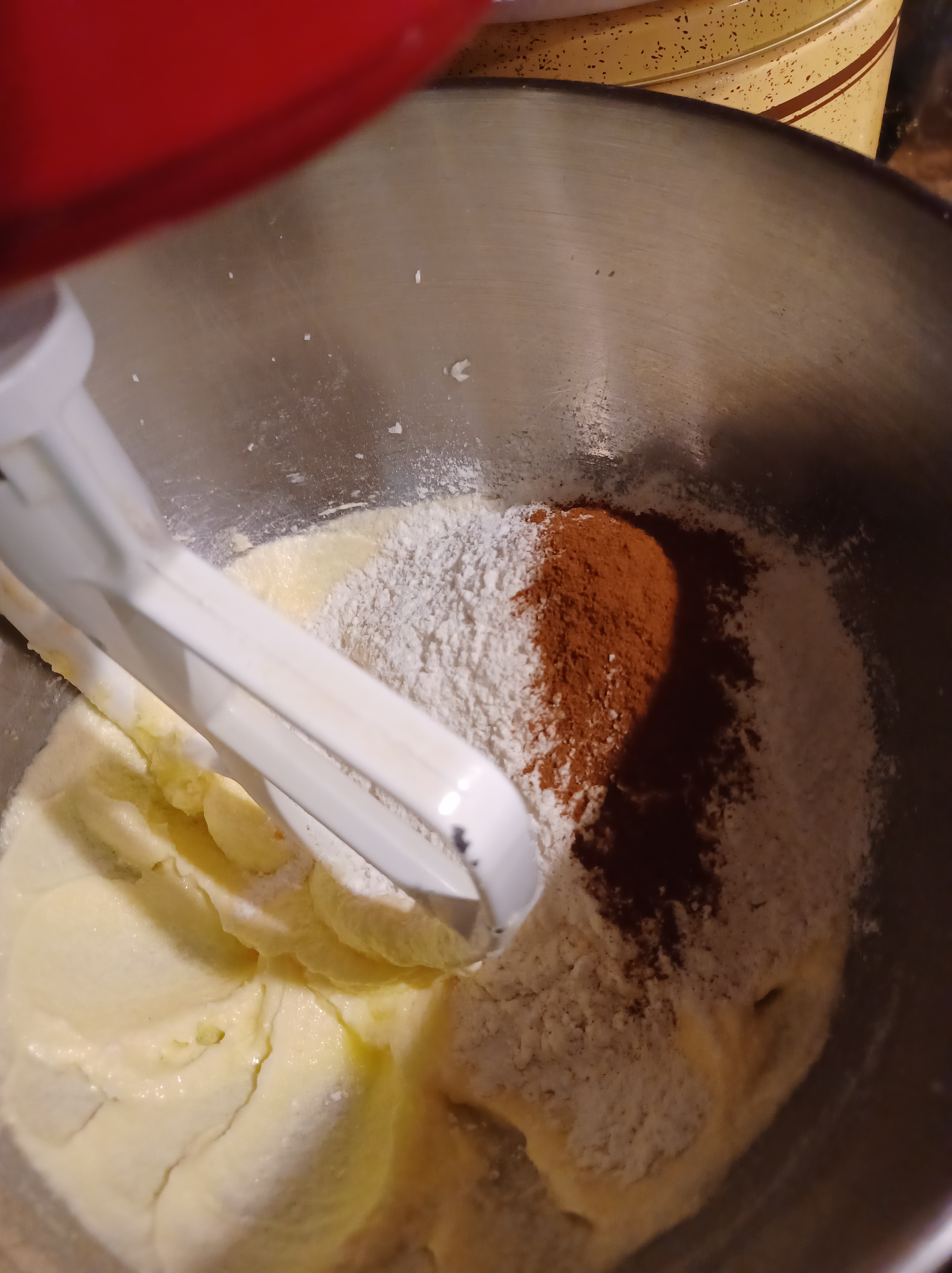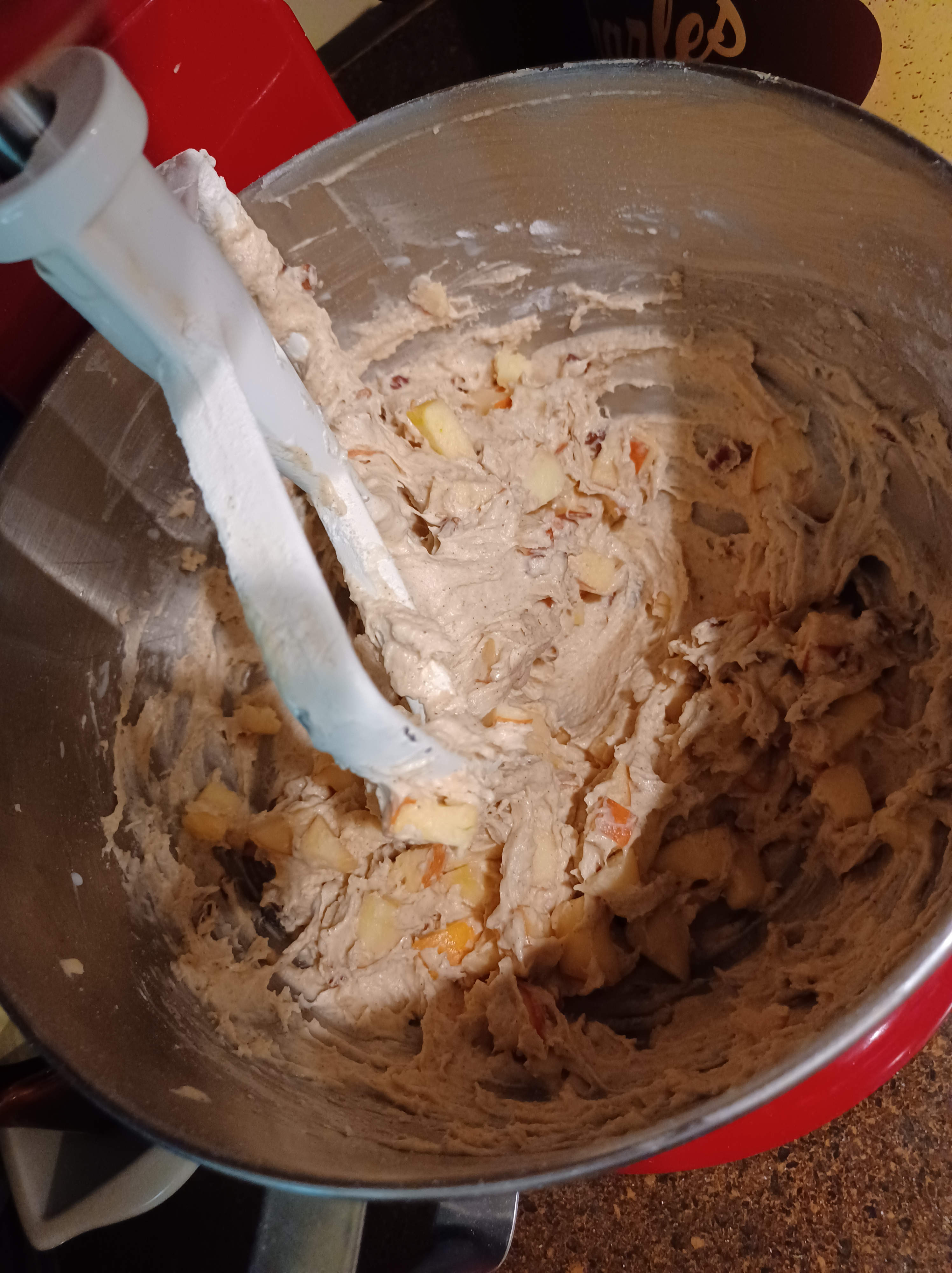 Now place the butter and sugar in your mixer bowl and cream together. Now add the egg and whip it up well. Now add the flour, baking powder, cinnamon, then add the milk and blend together. (it is a thick batter) Now add your chopped apples and pecans.