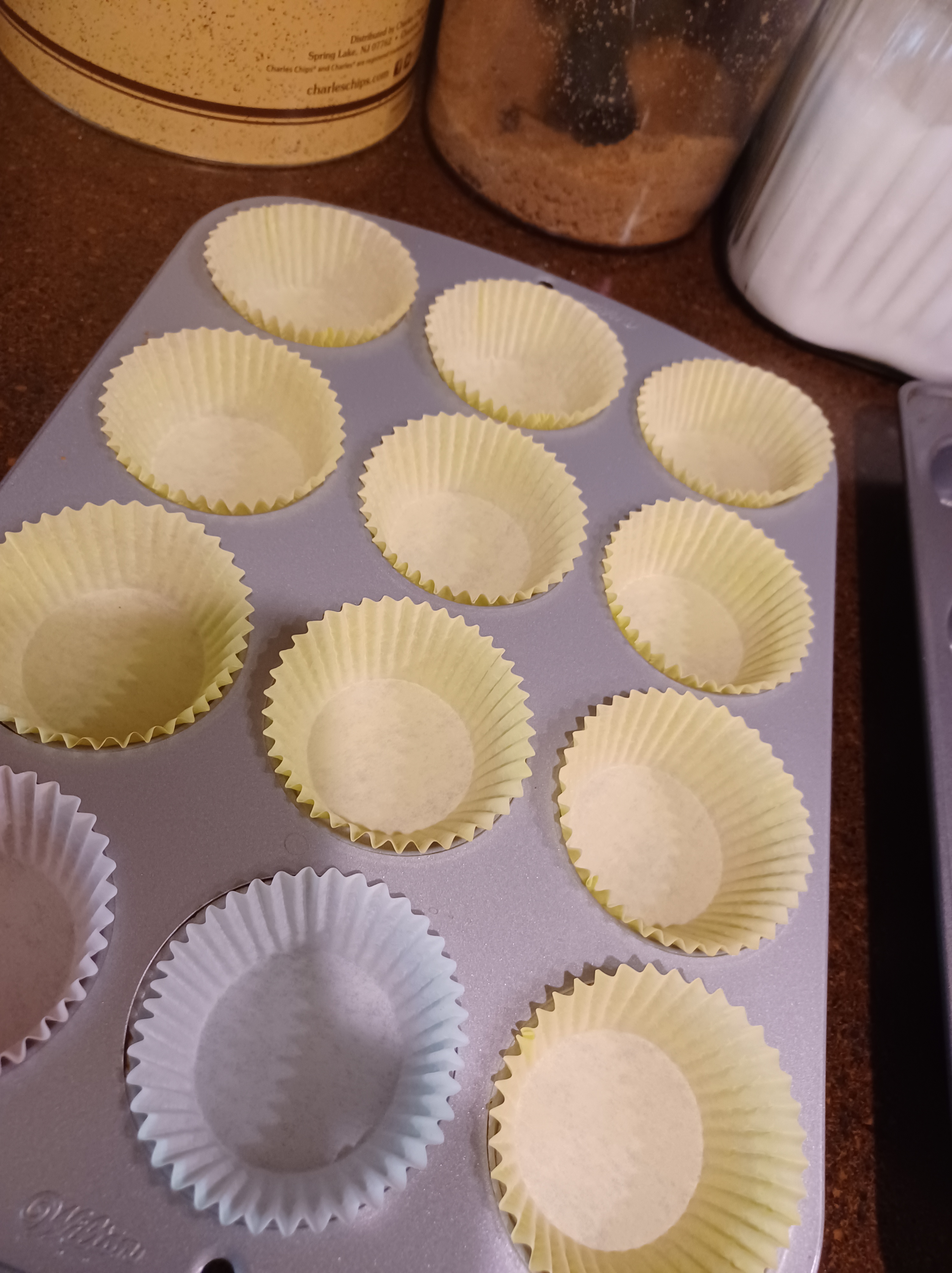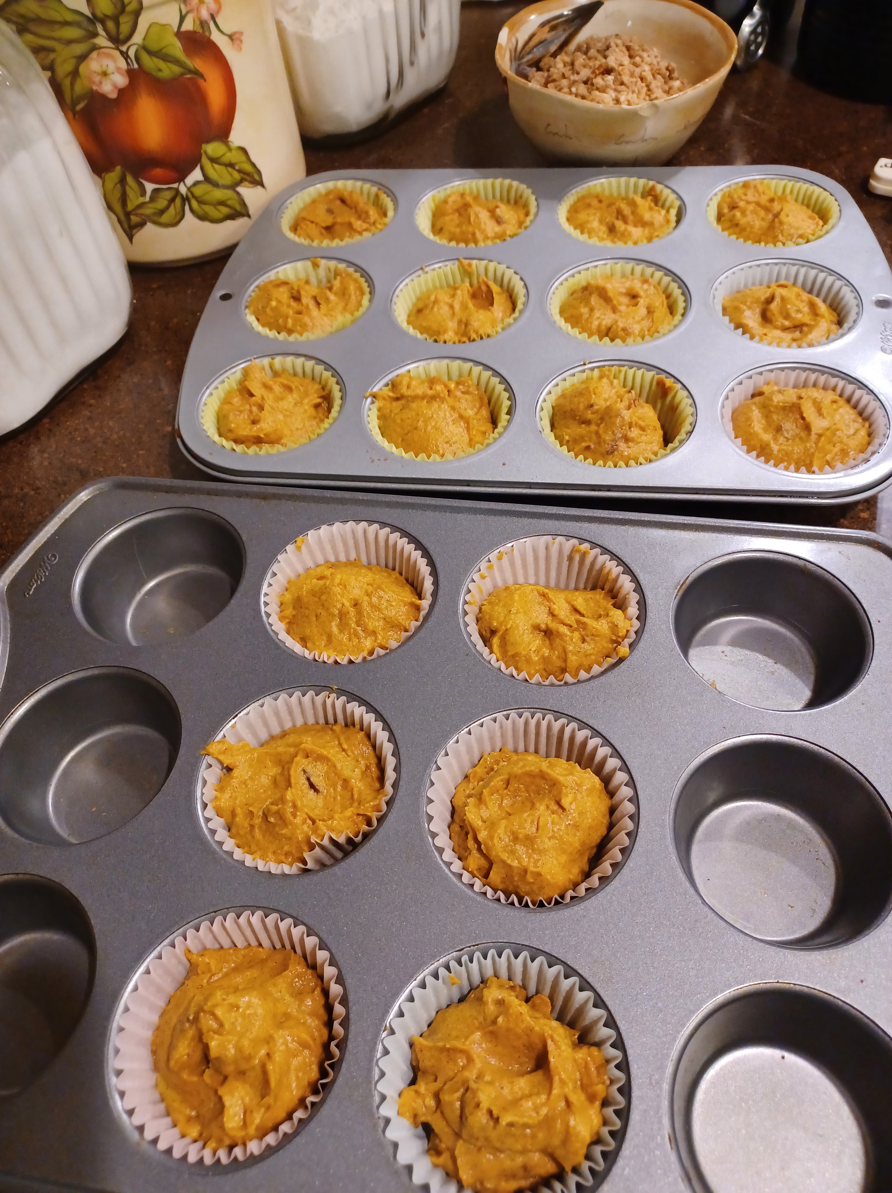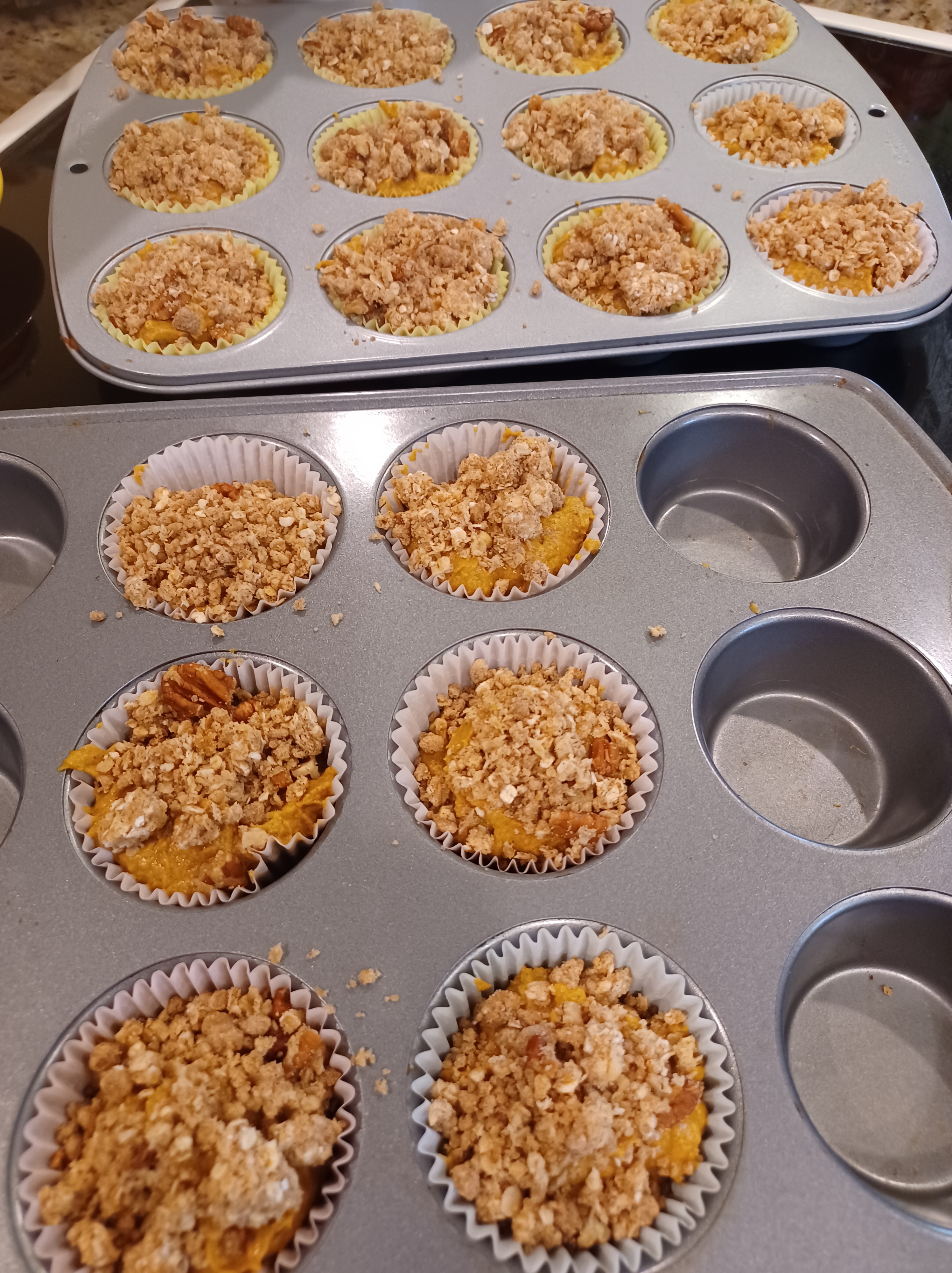 Now line your muffin pans with cupcake liners, you will need 17 or 18, I usually get 18. Now scoop your batter into the muffin pans, filling about 3/4 quarters full. Now is time to spoon the streusel onto the muffins.