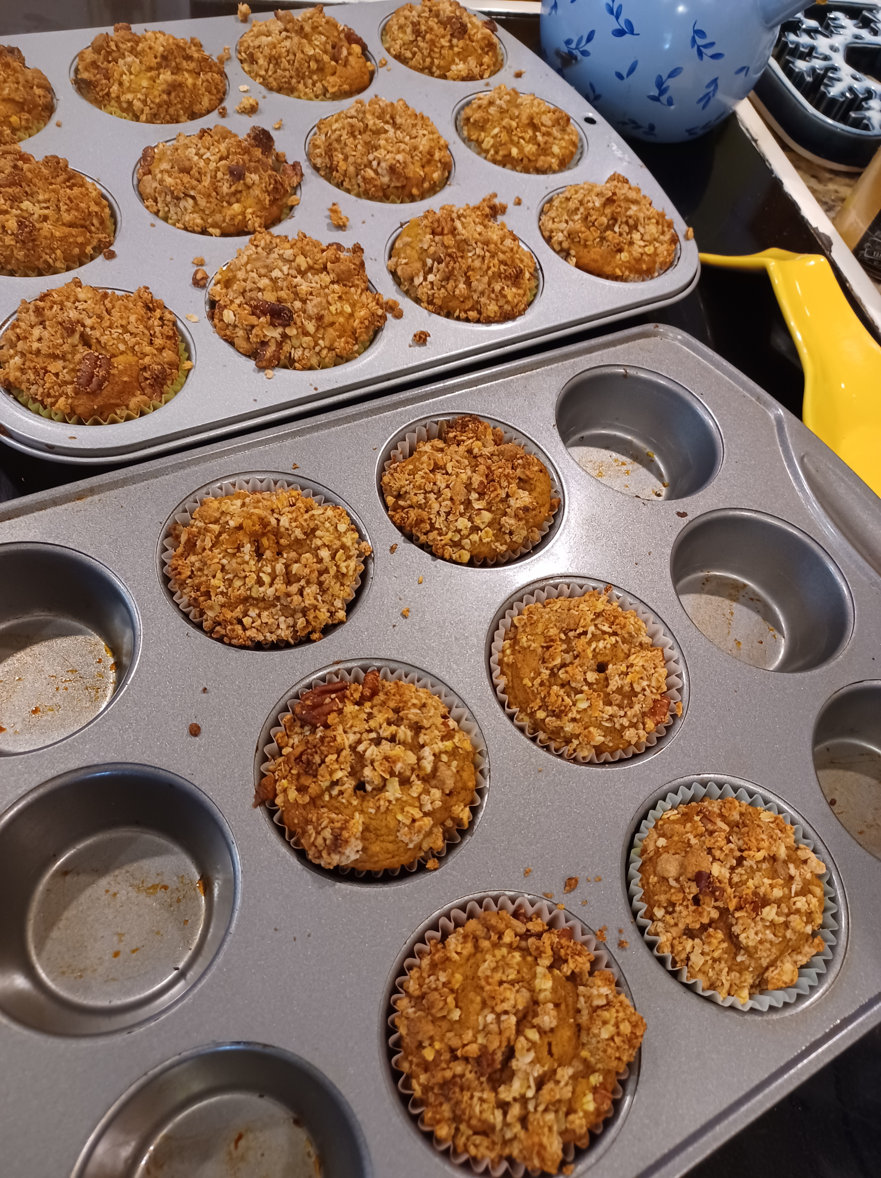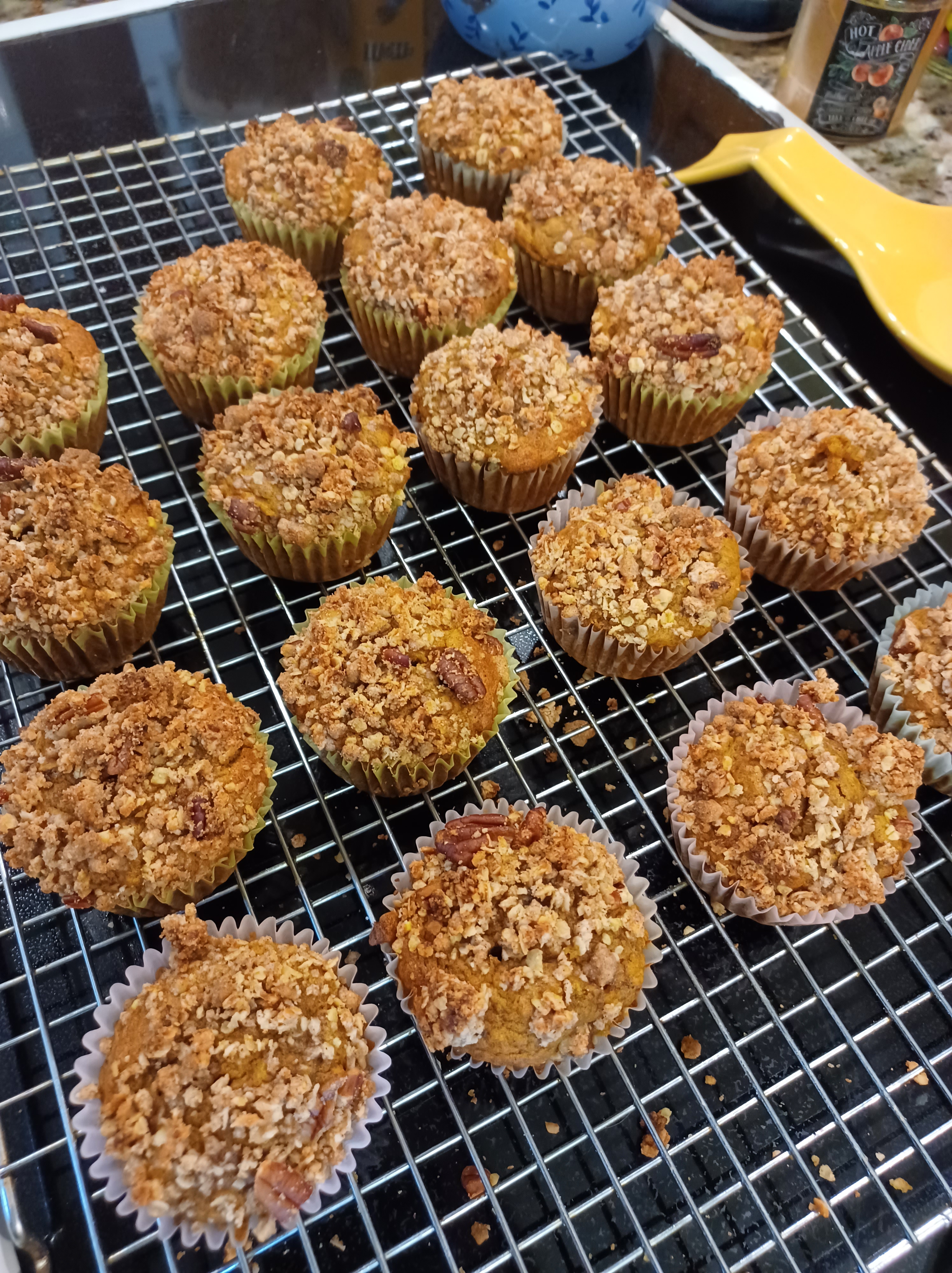 That means pumpkin season! For over 30 years I sold these delicious muffins at the farmers markets although I would make them in the big Texas sized muffin pans! At the markets, bigger is always better, but for home, these are the perfect size! I was well known for the delicious products I would bring. I hope you will give these a try, you will love them!