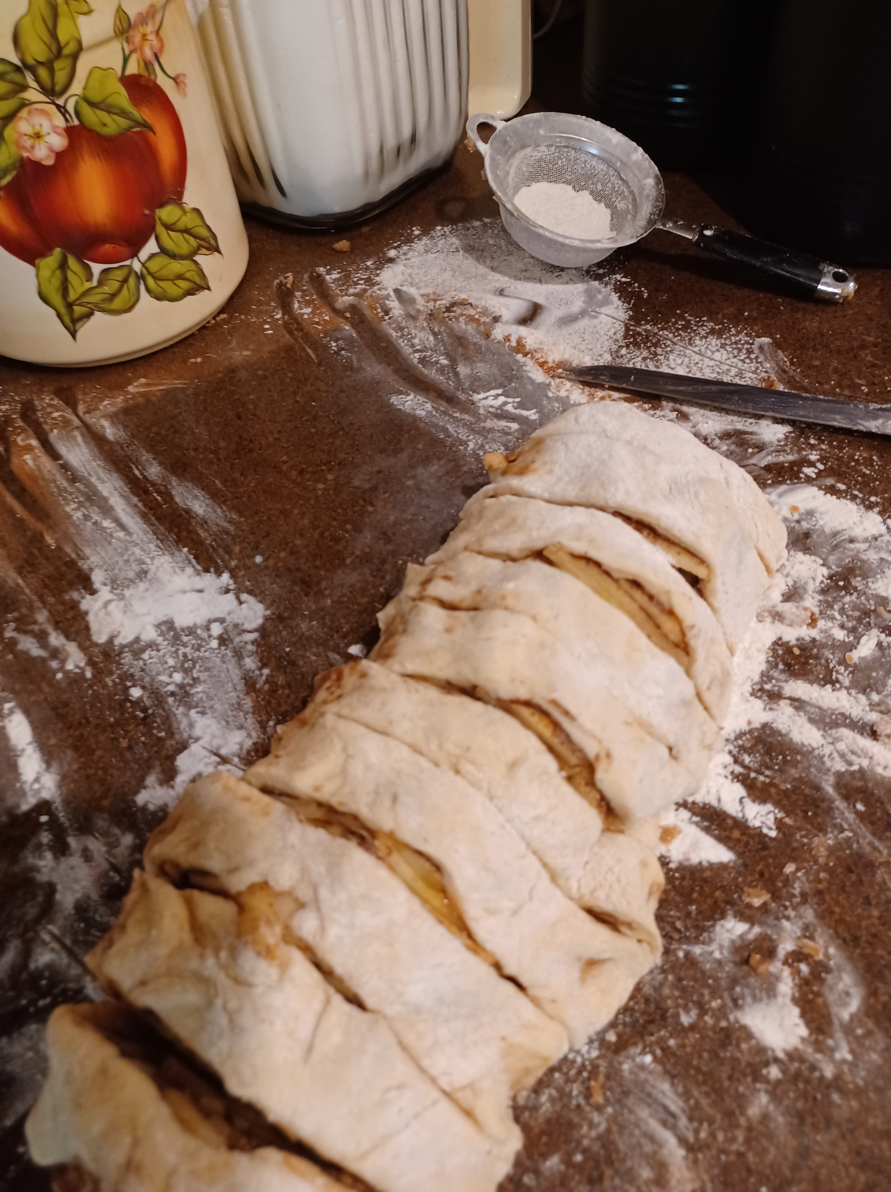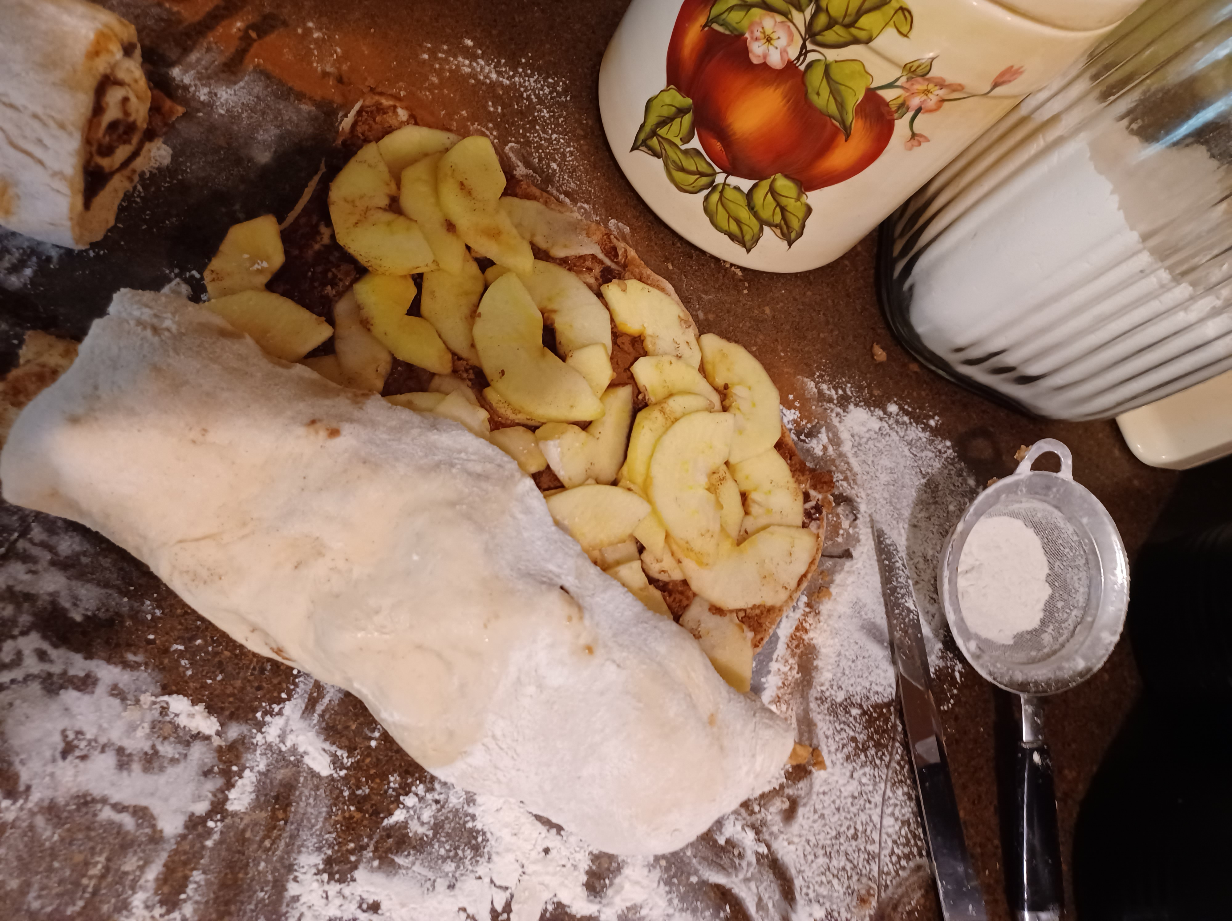 Now is when if you are making half regular and half apple filled, you cut your dough in half. Starting in the middle use a very sharp knife or bench knife to cut the dough in half. Now cover half with you sliced apples, then roll up. Take your time, it is a little tricky as the roll will be huge. Then slice the apple roll into 10 slices. I cut the roll in half, the cut each half into 5 slices. I cut a slice out of the mile, then cut each side piece in half. It is a bit tricky to learn all these things, but you can do it if you are careful.