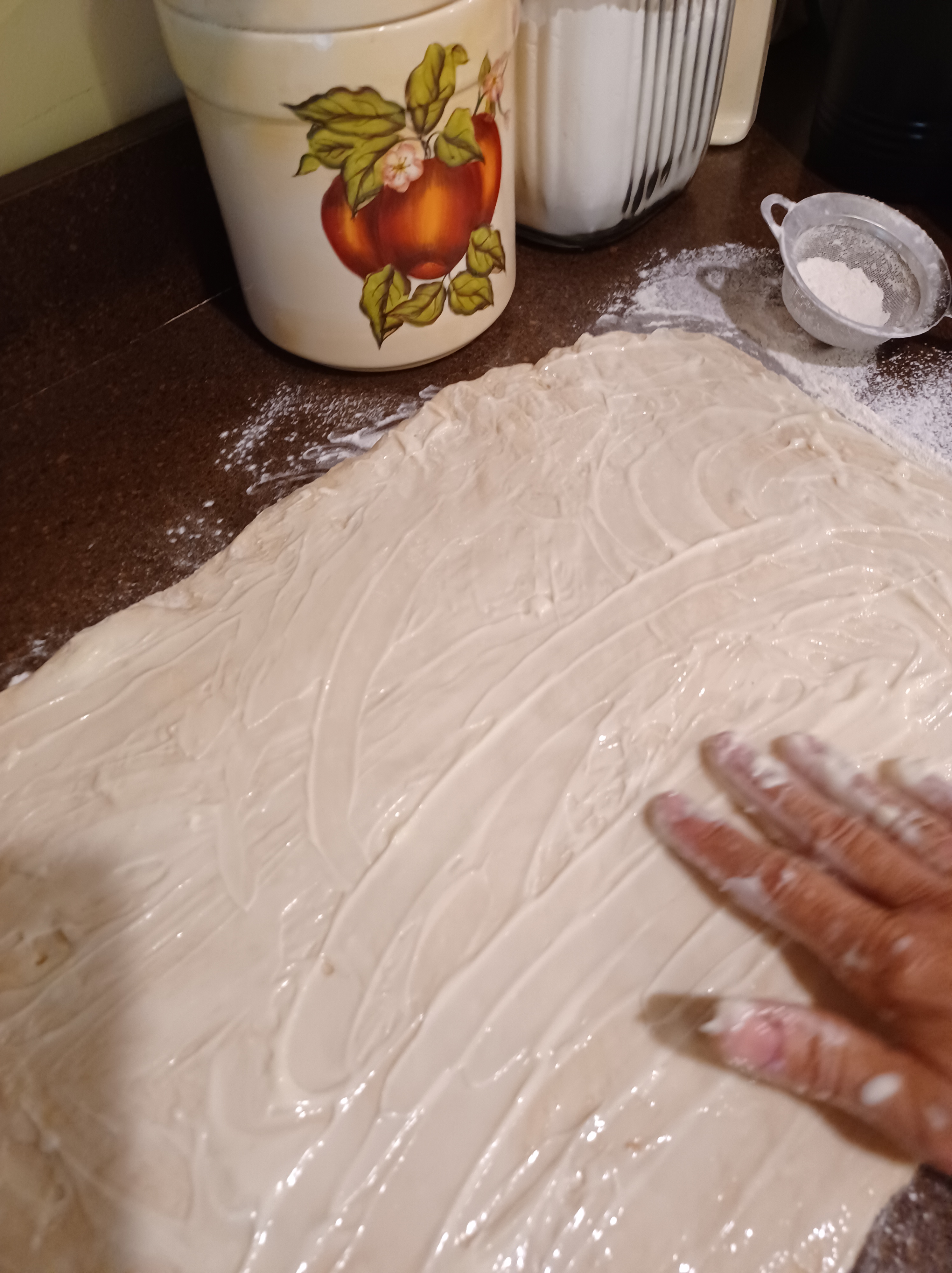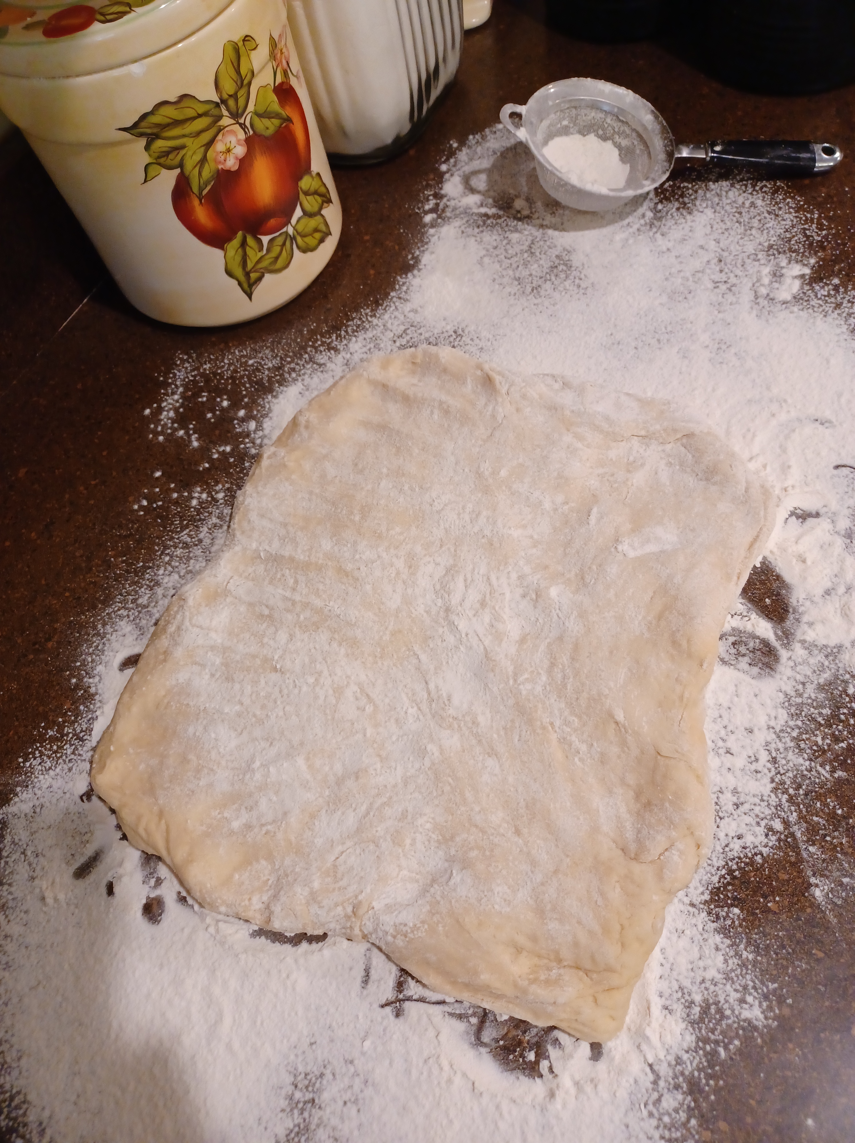 Pat or roll out your dough, trying to keep a rectangle. I always pat out my dough, that way I can feel the thickness and keep it mor even.