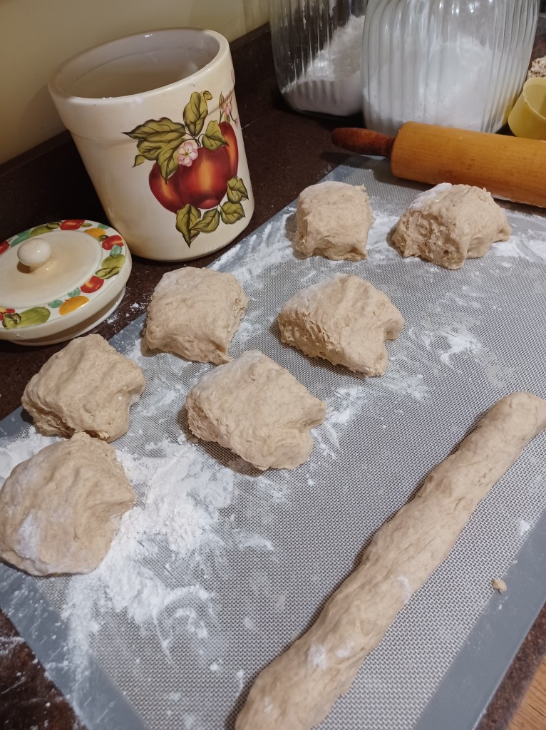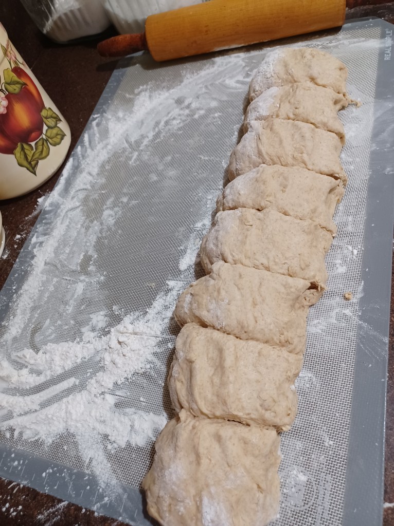 Now divide your dough log into 8 pieces. This is what I do, make sure you shape the dough, so it is as even as possible. Then cut the dough in half, then cut each half in half, do this one more time till you have 8 pieces, if you follow this technique, you will have 8 pieces nearly the same size.