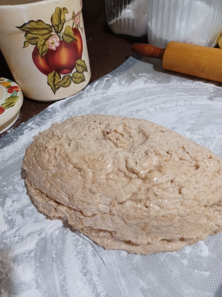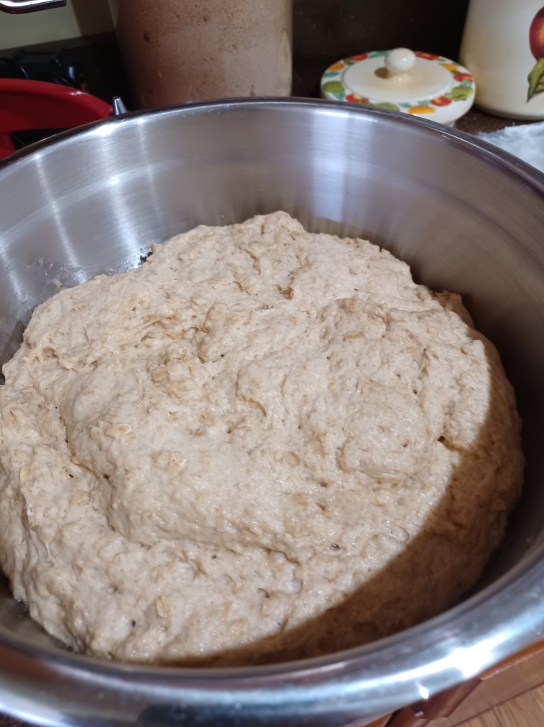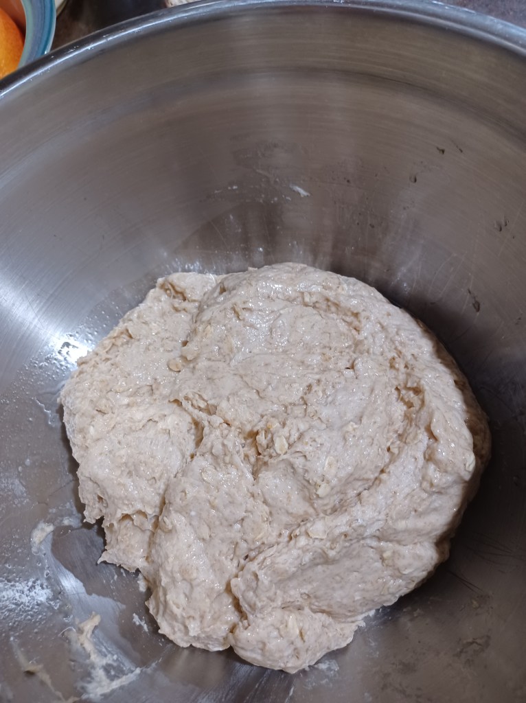 Now add the eggs, whole wheat flour, all-purpose flour and oats. Add the salt, mix the dough till well blended. (I always use the full 5 cups of all-purpose flour) Now place the dough in an oiled bowl, cover with a towel and let rise till doubled. (About 45 minutes to an hour)