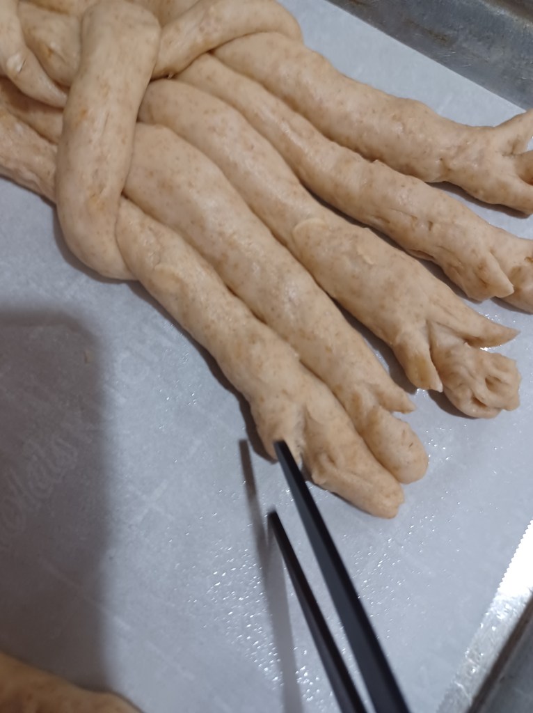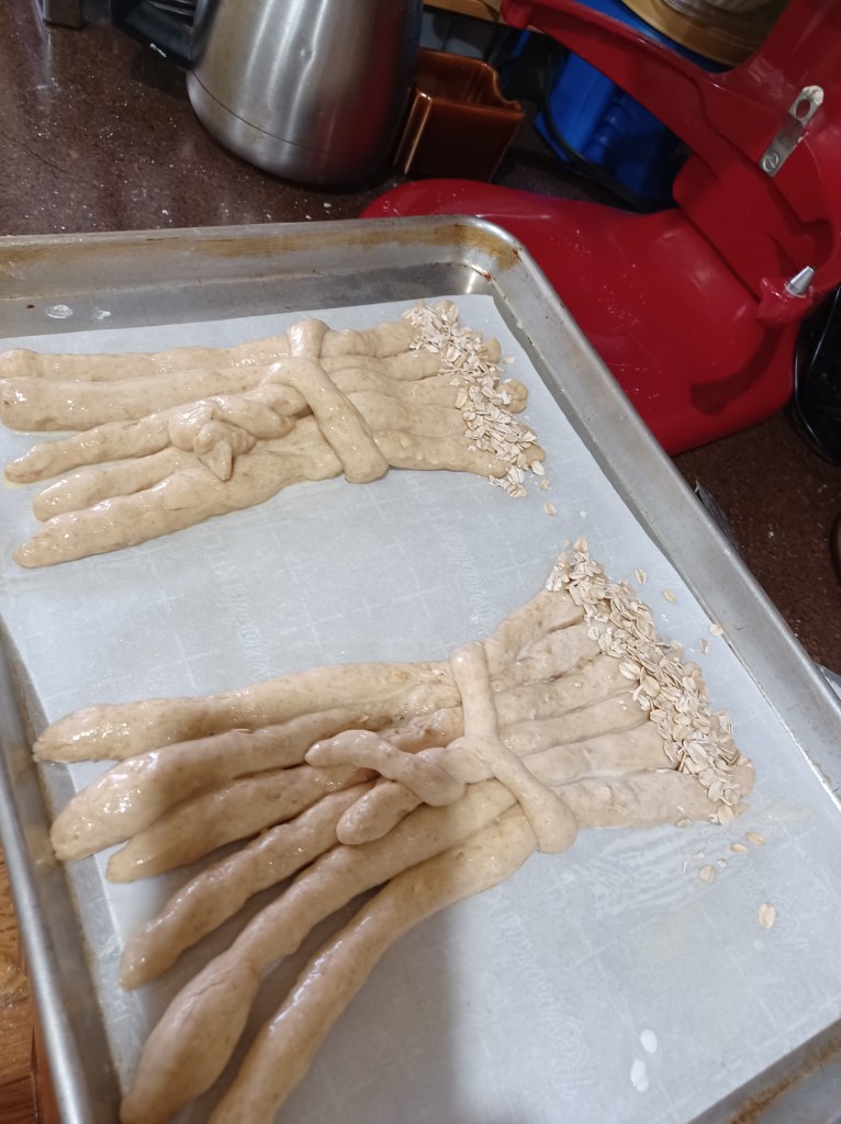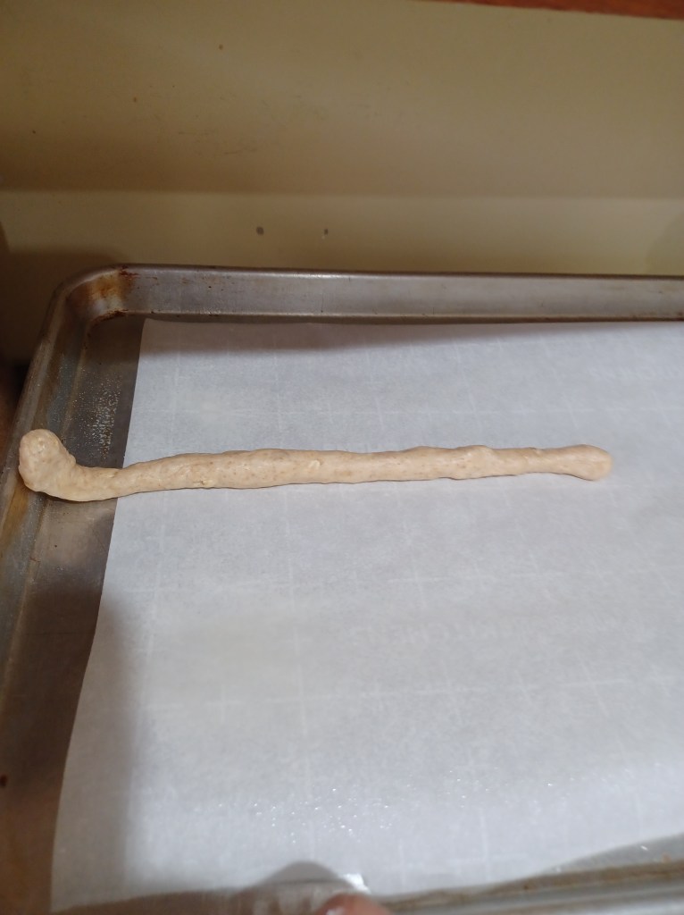 Now that you have your sticks all on the baking sheet, take the ends of the piece of bread stick pull them gently up and twist them together 3 times, as shown. This makes your sheeves of wheat bread sticks! Now finish each pan, then take a pair of scissors (This works best) and cut the little “wheat” on the top of the sticks, as shown