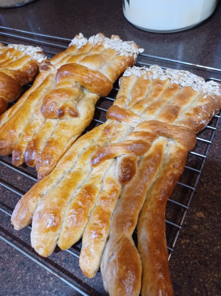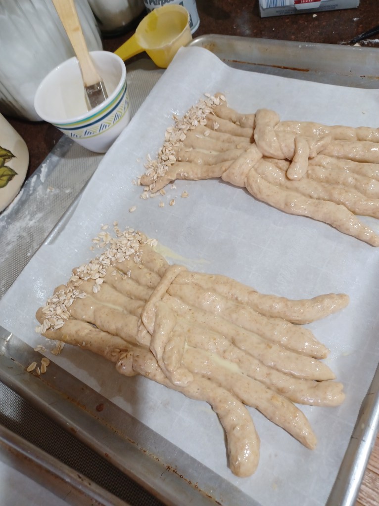 Now egg wash your sticks and sprinkle the tips you cut with oats. Let the sticks rise for about 30 minutes.