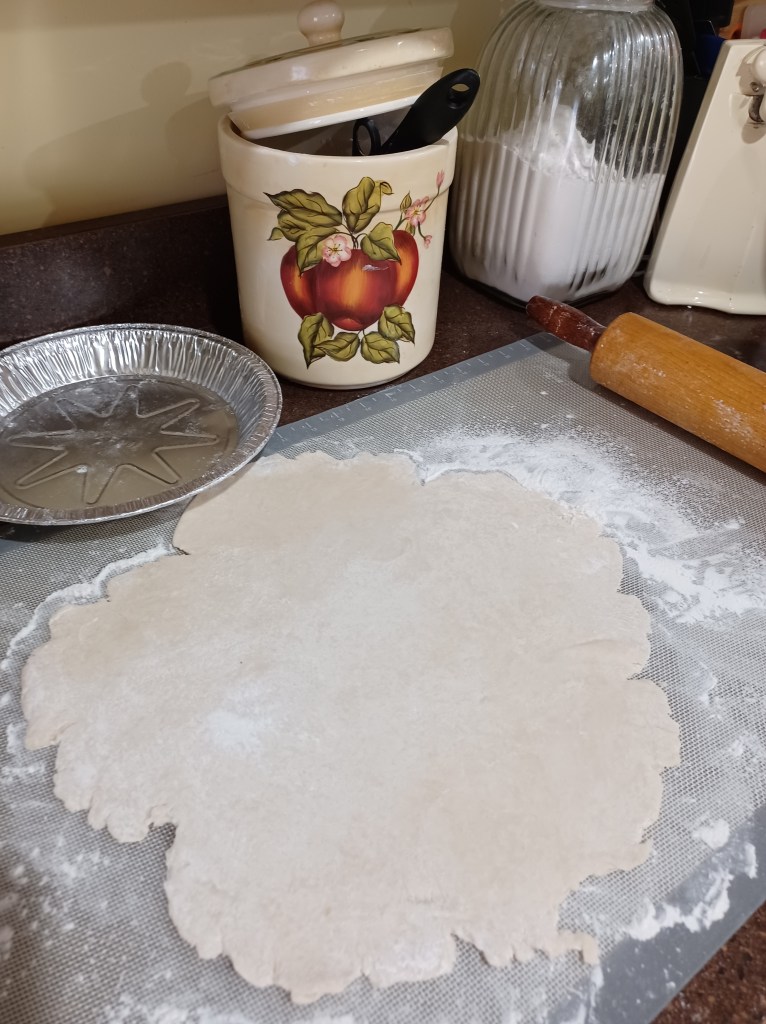 First thing to do is make your crust. Take 3 cups of flour, 1 cup of Crisco, 2 teaspoons salt, 2 Tablespoons sugar, cut it with a pastry blender. Then use your hands to work it to look like peas. Add cold water to make a nice dough. Start with a 1/4 cup or so, then add a little at a time till you get the right consistency. Now roll out your crust on a floured surface. This will make 3 crusts.