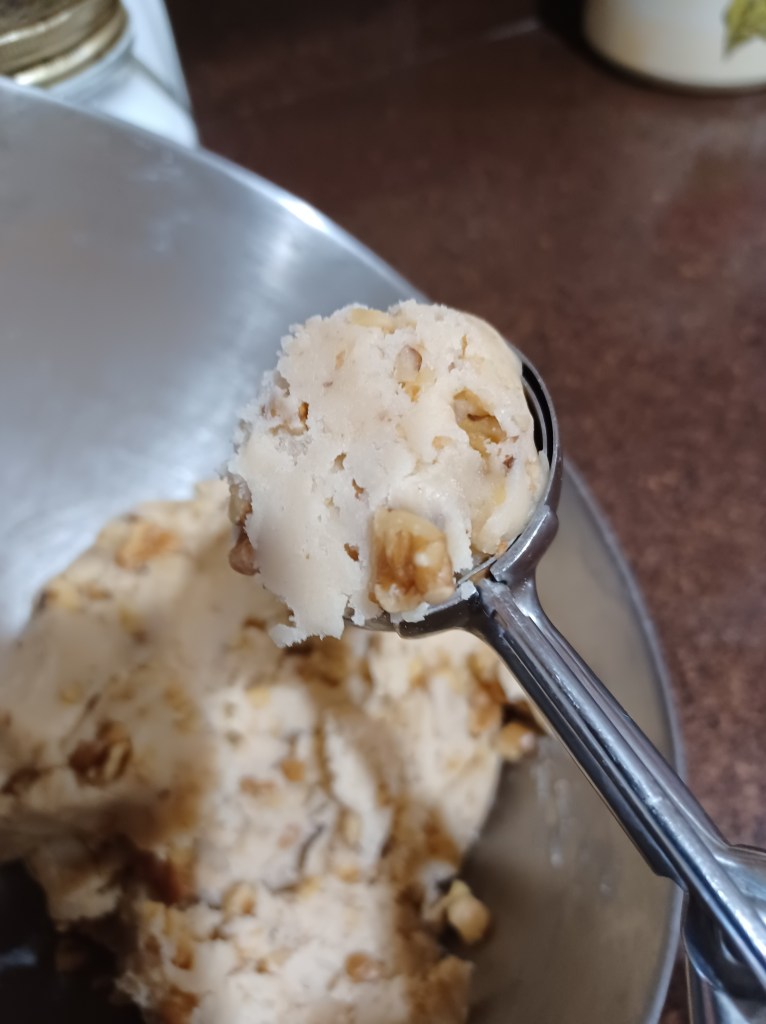 Place your butter and the powdered sugar in your mixer bowl and cream together. Now add the flour, salt, evaporated milk and vanilla. Blend well. (Add a little more evaporated milk if needed, I added about 2 Tablespoons more) Now add your chopped nuts and blend well.