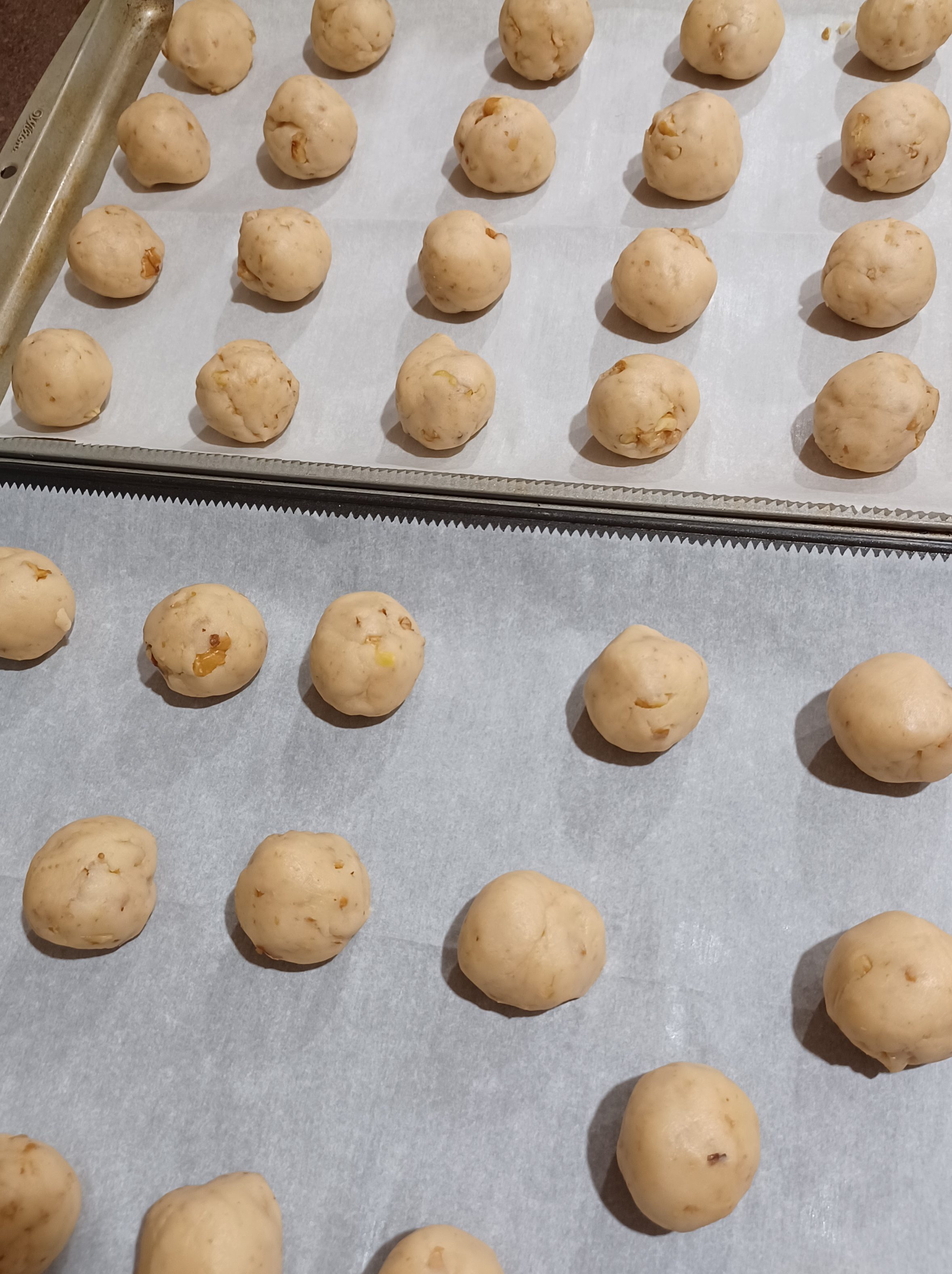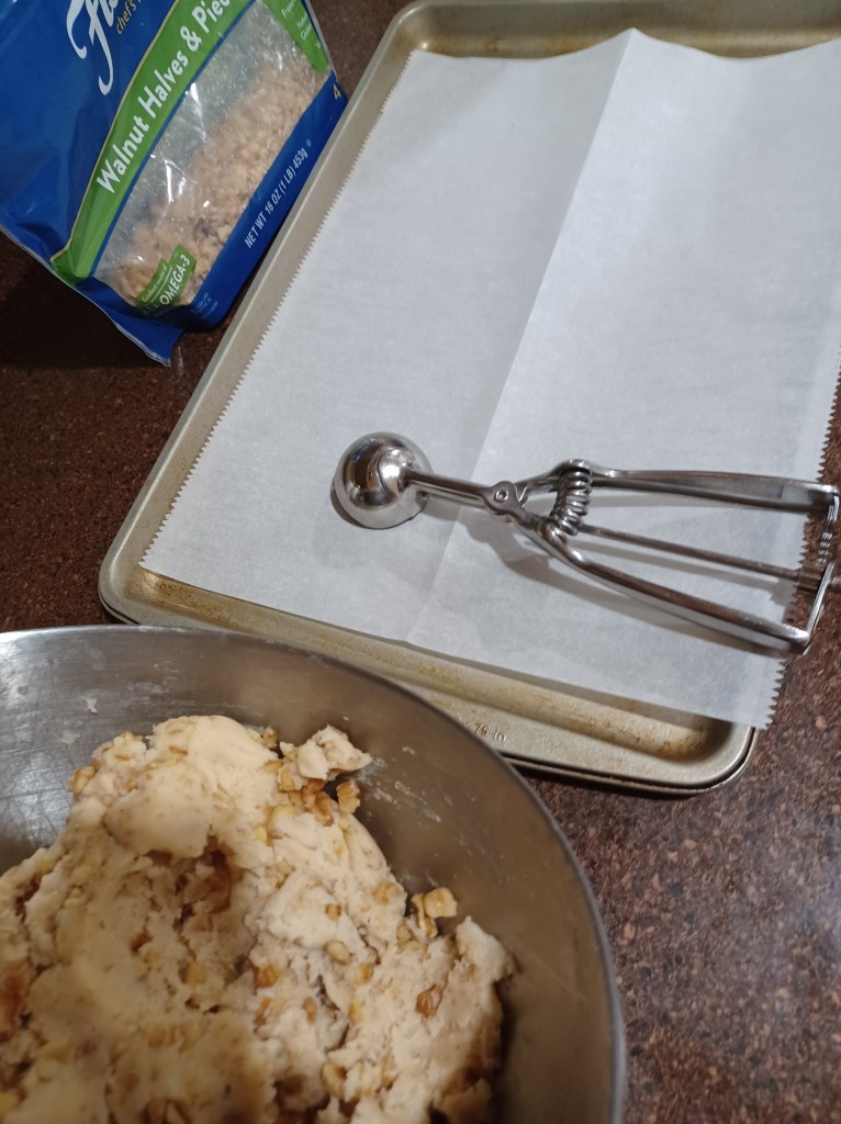 Now place parchment sheets on your 2 cookies sheets, set aside. Now scoop out the dough with a 1-inch cookie scoop. Scoop them and place them in your hand. Roll into a ball, then place on your cookie sheet. These cookies do not rise much so you can place them close together on your sheet.