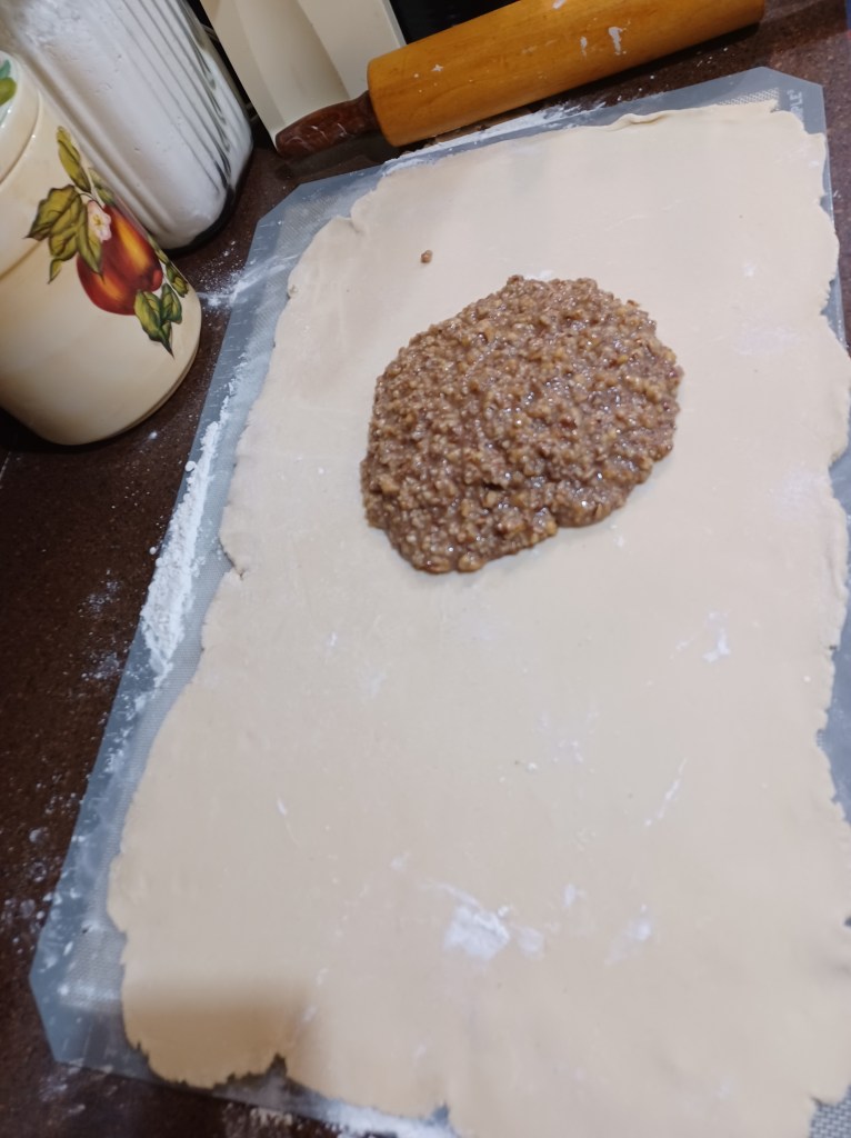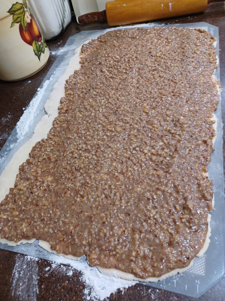 Now that you have rolled out your dough, and this takes a bit of time, make sure you roll it about 12 inches wide and about 20 inches long. Place the cooled nut mixture on the dough, the use an offset spatula to spread it out. Cover the entire surface coming all the way to the edges, except on the back side long edge. Leave about 1 1/2 inches with no nut mixture.