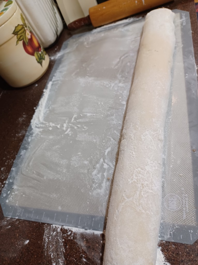Now roll the dough as shown, until you get a big, long dough, as shown. You want the roll to be as even as possible, so when you have it rolled up, you can manipulate the roll as you go, gently squeezing and pulling till you get a nice log.