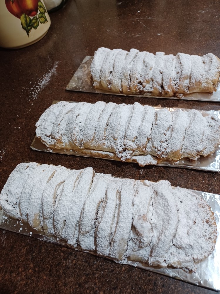 This is Rugulah….a rich cream cheese butter pastry filled with nuts. It is absolutely delicious and a real family favorite, as well as a favorite holiday treat of my customers. Many people would buy this as a gift for neighbors, family or friends.