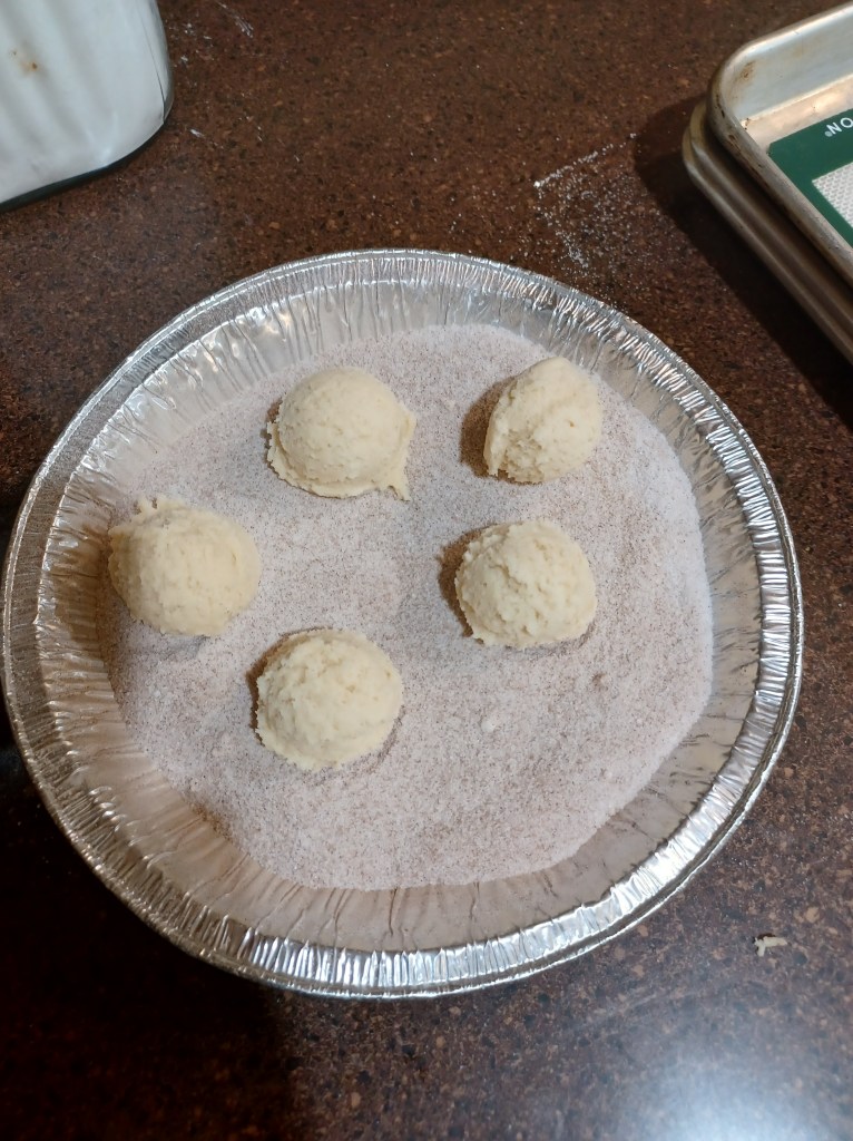 Now scoop out the dough and place each ball into the cinnamon sugar and roll around. I use a pie pan for this, and do 6 or so at a time.