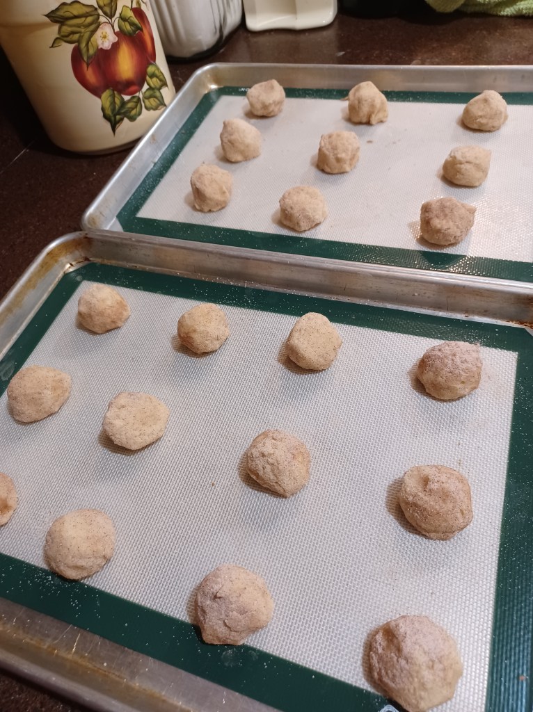 Place the cinnamon sugar dough balls onto your prepared baking sheets.
