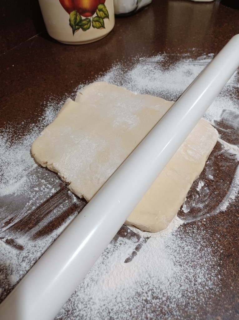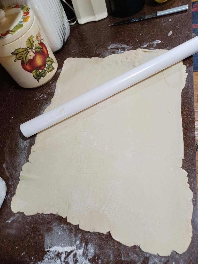 Now take your dough out of the fridge, let it sit about 10 or 15 minutes. Now roll out the dough. (I have a couple rollers that are PVC pipe, I use them for big dough roll outs, as well as fondant when I make cakes)