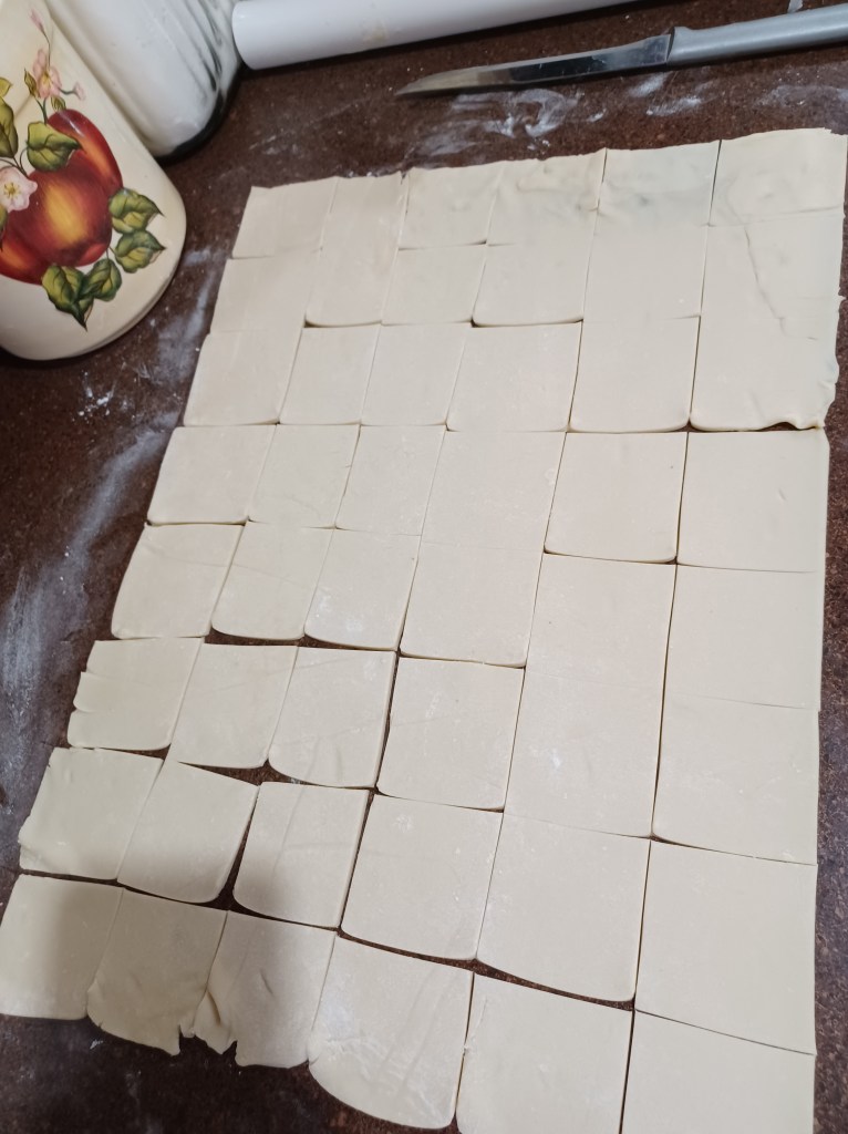 Now trim the edges to make a rectangle, then cut the dough into squares about 3 inches by 3 inches.