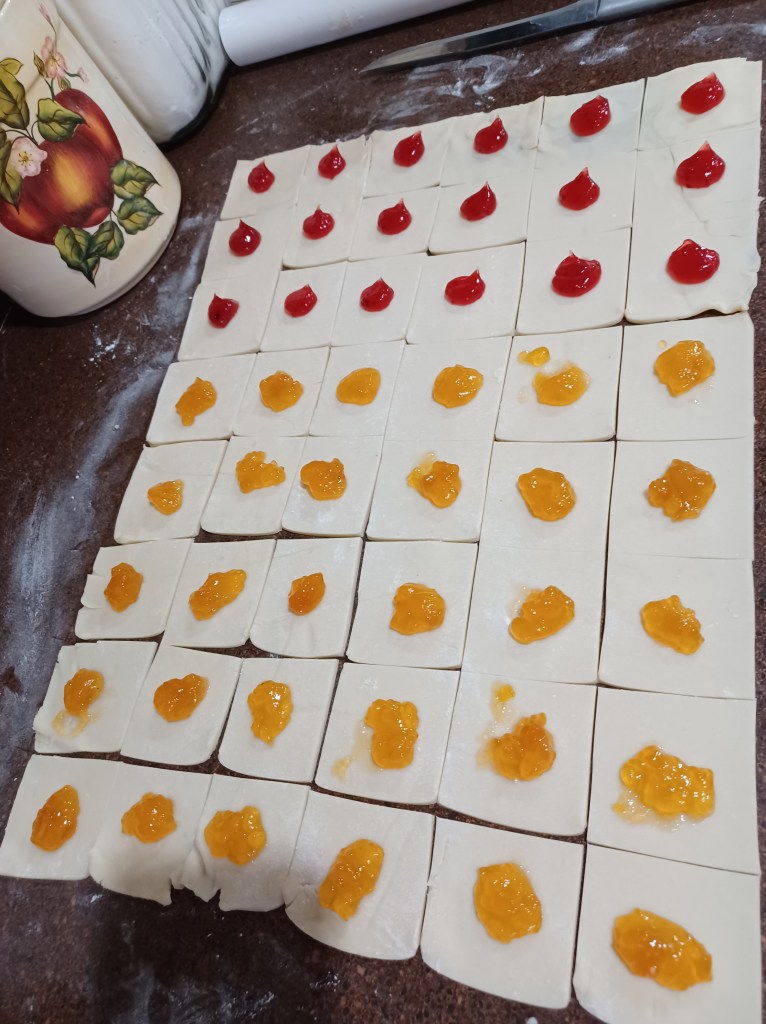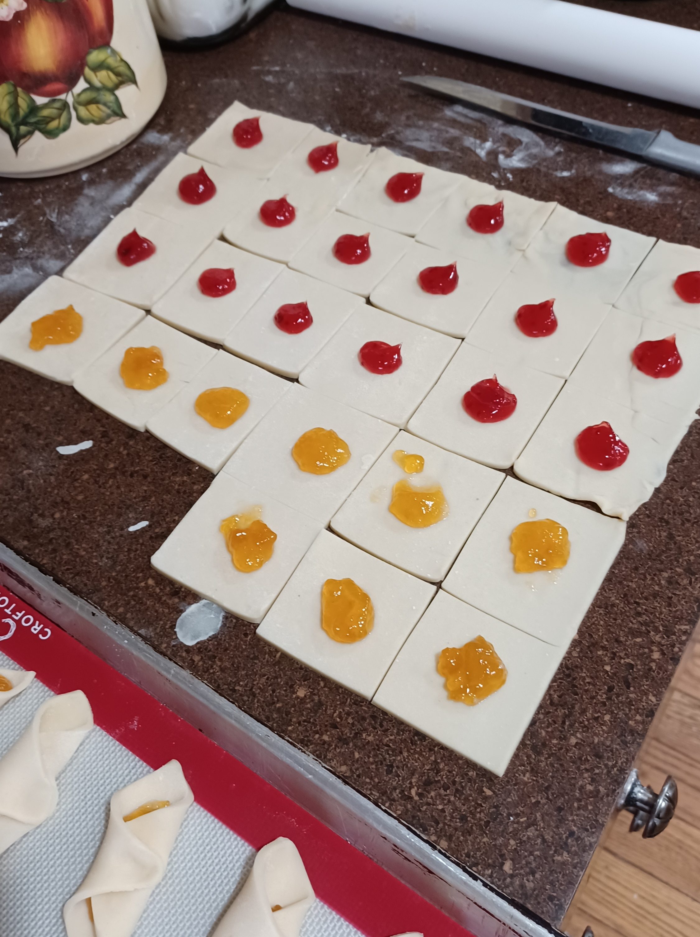 Now place your jam onto the center of the dough, you can use disposable cake bags, or a 1/2 teaspoon. I use both.