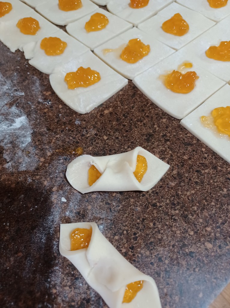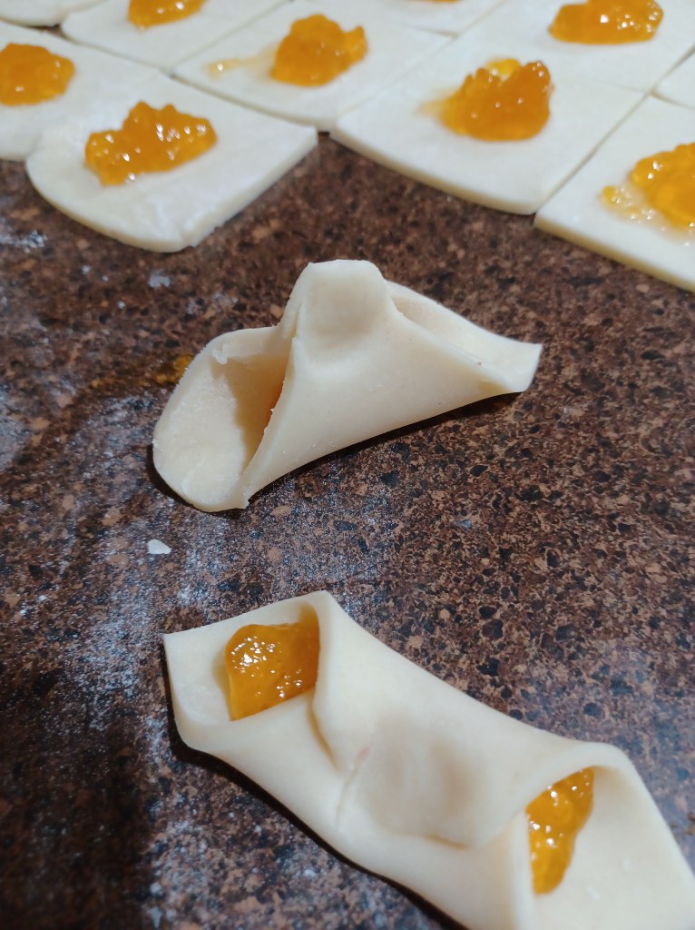 Now take a filled square and bring 2 corners up to the middle as shown above, then fold that down and press it lightly with your finger, now move to a baking sheet.