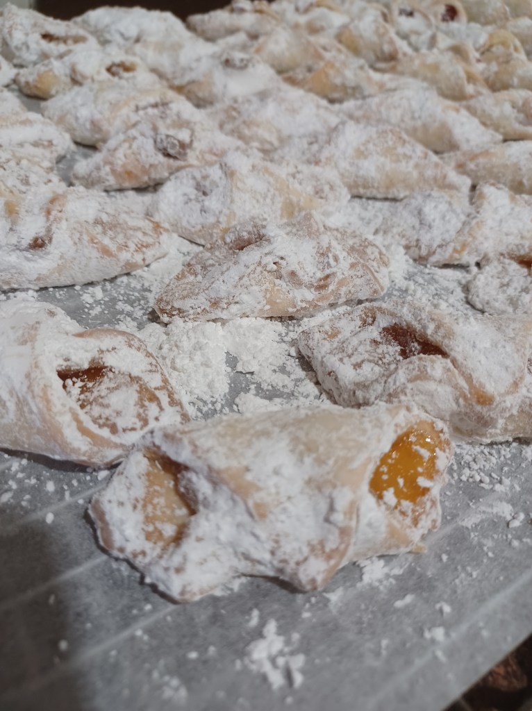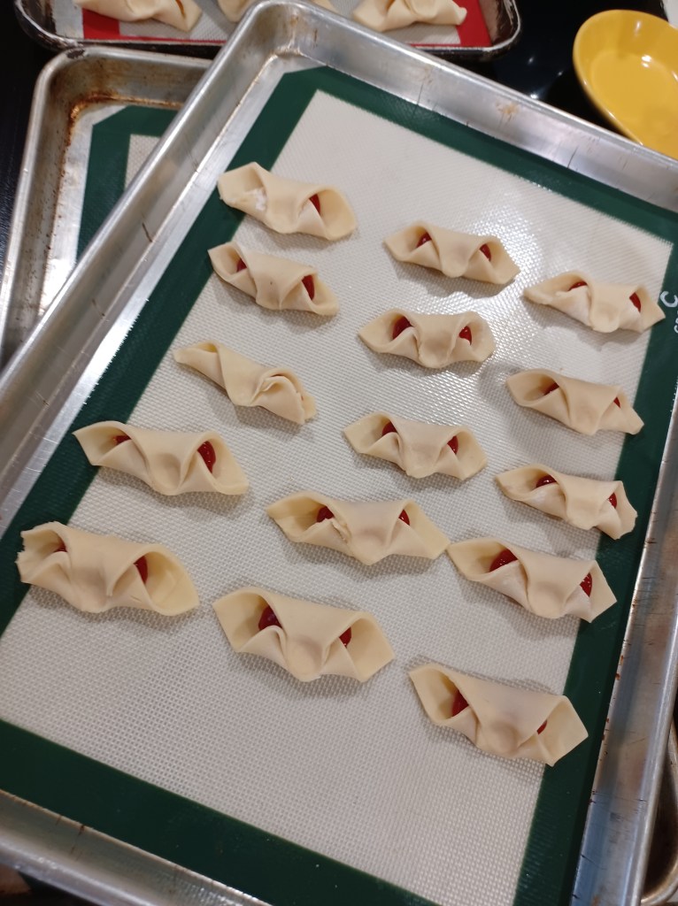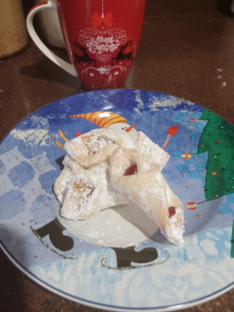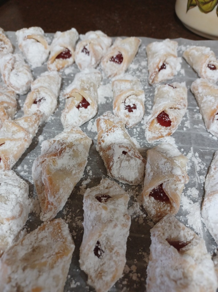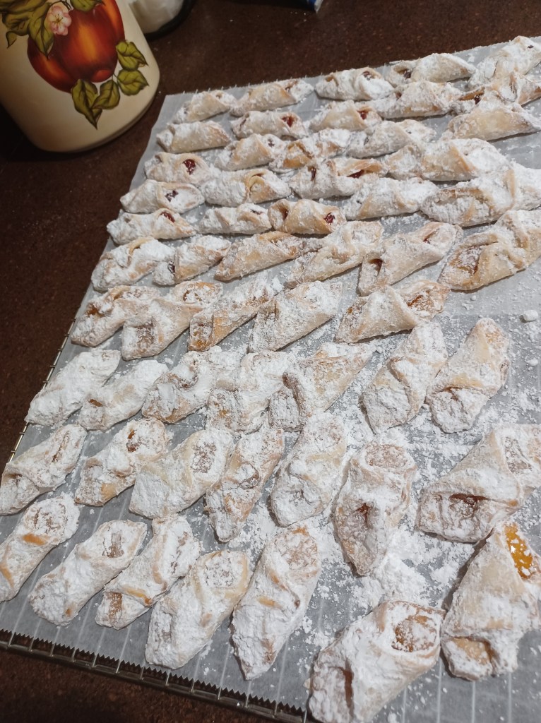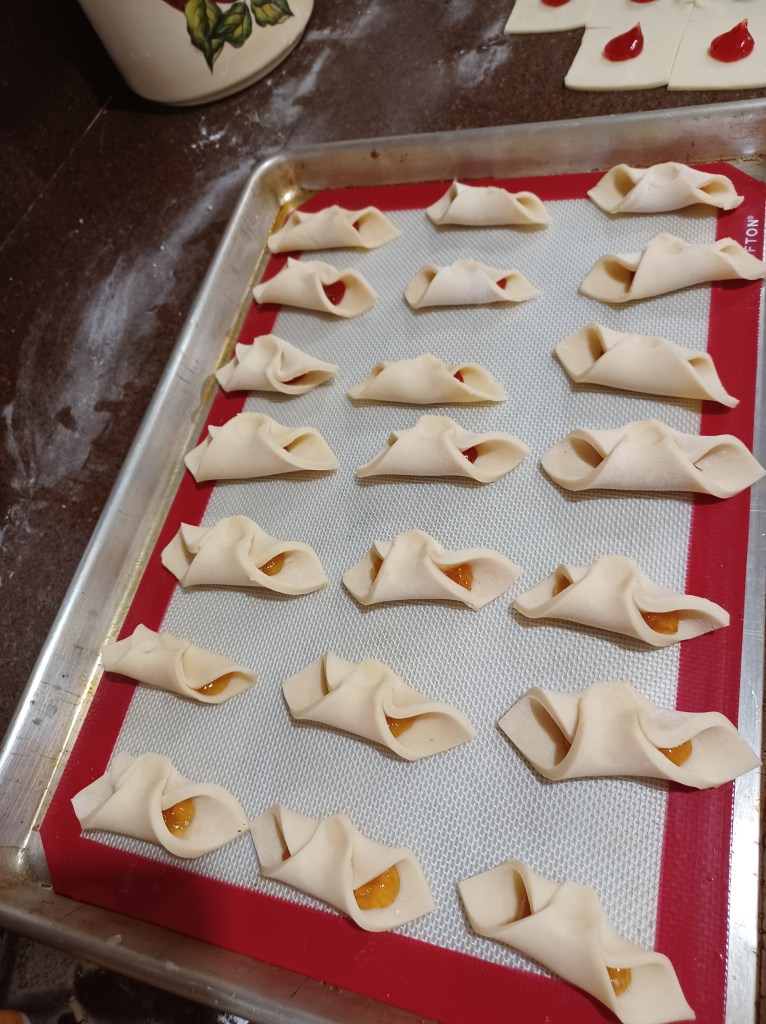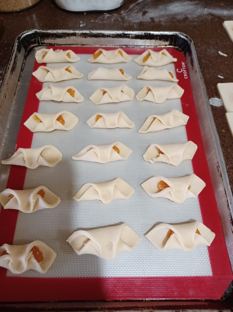 These are Kolacky! They are extremely popular in north-east Ohio where I grew up. They are yummy! I made them with apricot jam and raspberry jam. Both are delicious. They are always a hit wherever they are served. They are easy to make, you just need to plan a little bit ahead, as the dough has to chill. I hope you will try these delicious little cookies; you will be glad you did and so will your family and friends!