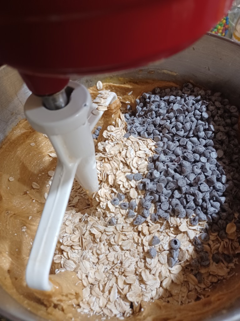 Place butter, peanut butter and the 2 sugars into your mixer bowl. Cream well, then add vanilla, baking soda, salt and oats, mix well. Now add the mini chocolate chips and blend well.