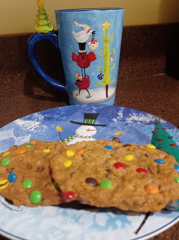 These are Monster Cookies! They are gluten free if you make sure your ingredients are! These are a larger cookie, and at the farmers markets they were giant! The customers there absolutely loved them, and I had to bake tons at a time to serve them! They are a really delicious cookie with oats and peanut butter, mini chocolate chips and each cookie dipped into mini baking M&M’s, then baked to yumminess! Monster cookies are a great addition to your holiday cookie display! I hope you will try them.