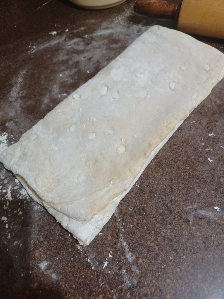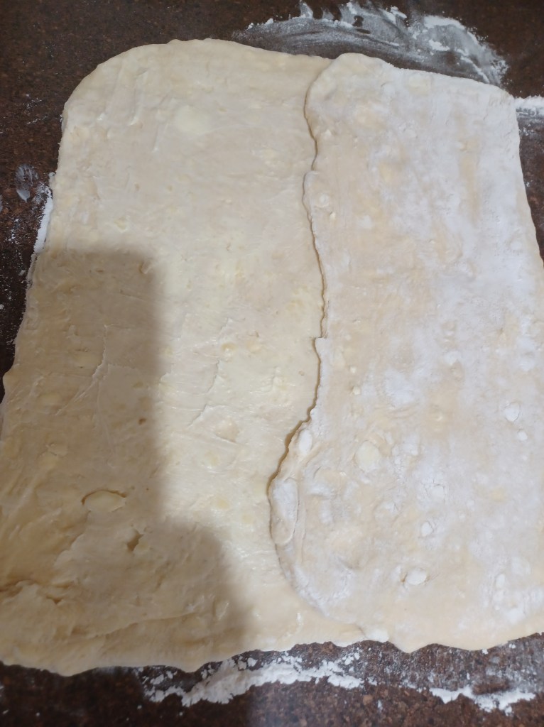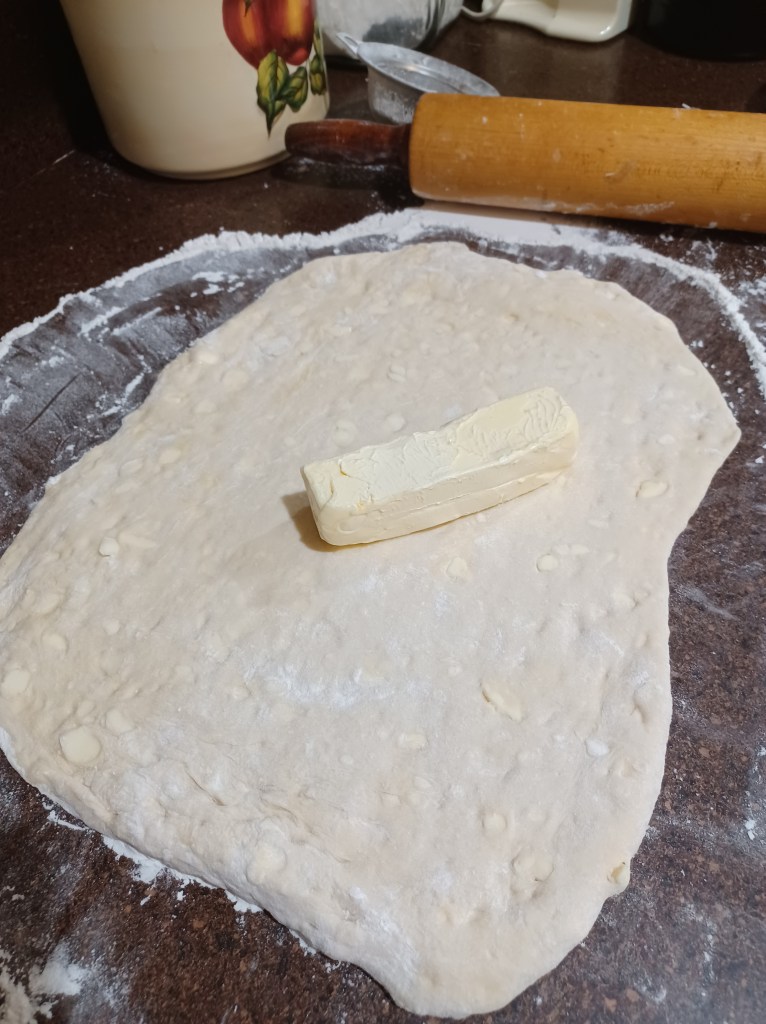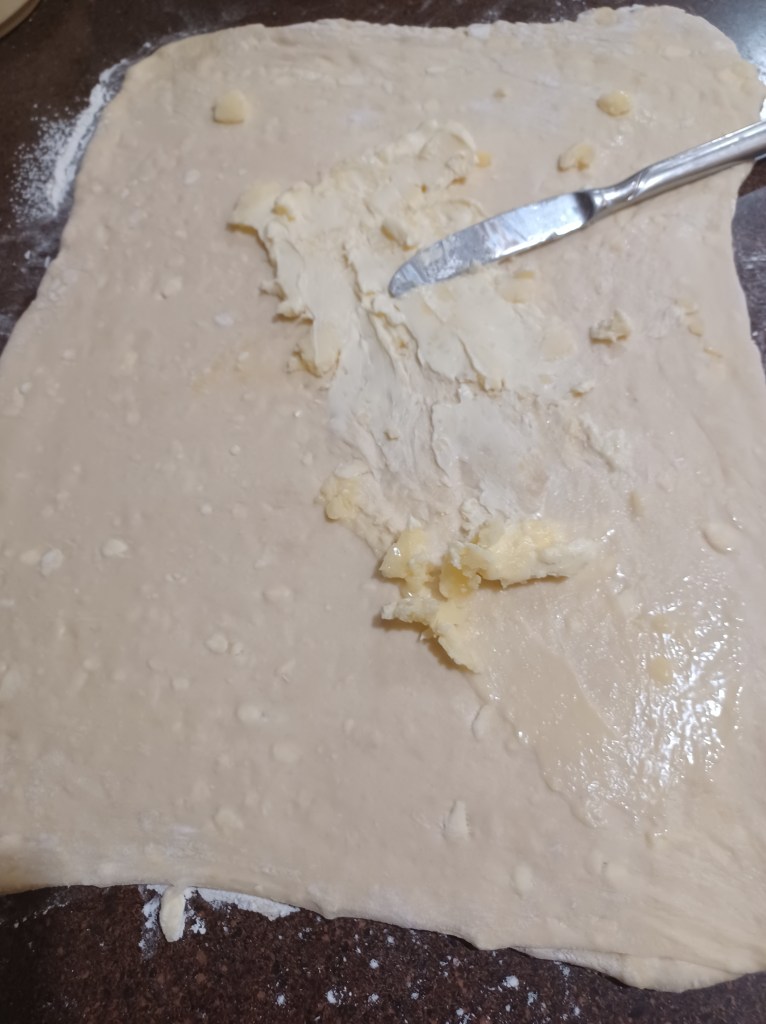 Now repeat this process 2 more times till you use all the butter. Now on the final butter/fold step, refrigerate the dough for 1 hour.