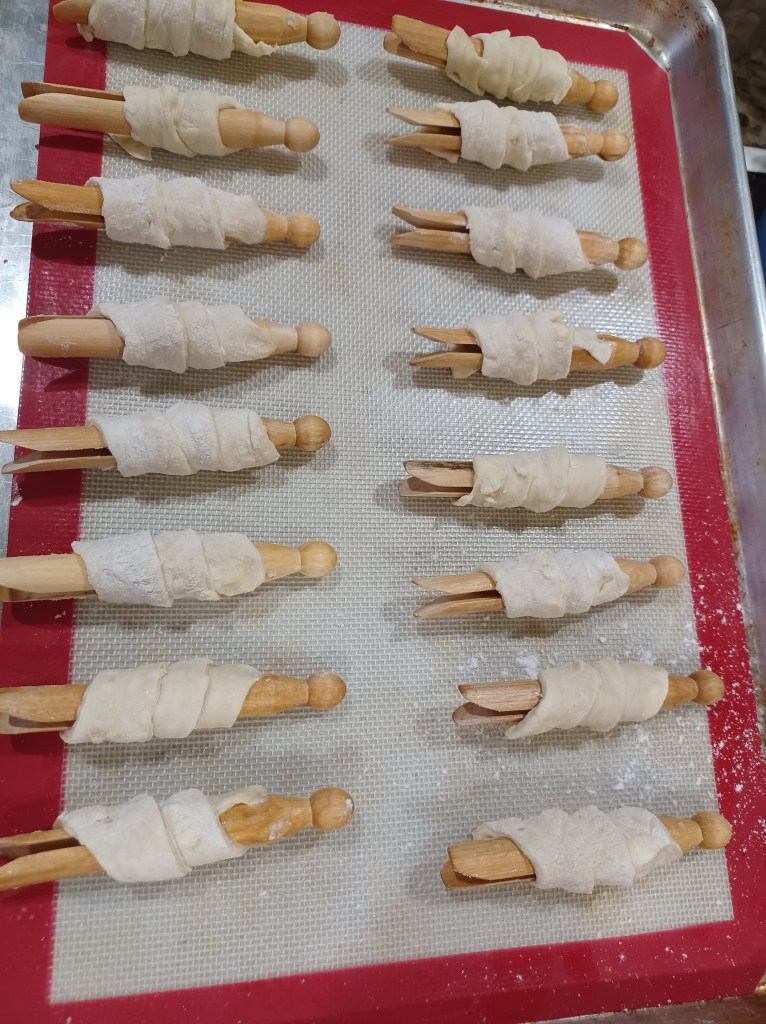 Now take the dough out of the fridge and cut into 4 sections, as shown. Put the other 3 portions back into the fridge, only work 1 dough at a time. Roll out 1 portion, I actually rolled it long and narrow, the sliced the dough into about 1-inch-wide portions. Take a clothespin, a section of dough, gently stretch it as you roll it around the clothespin then set it on a baking sheet lined with a silicone mat or parchment.