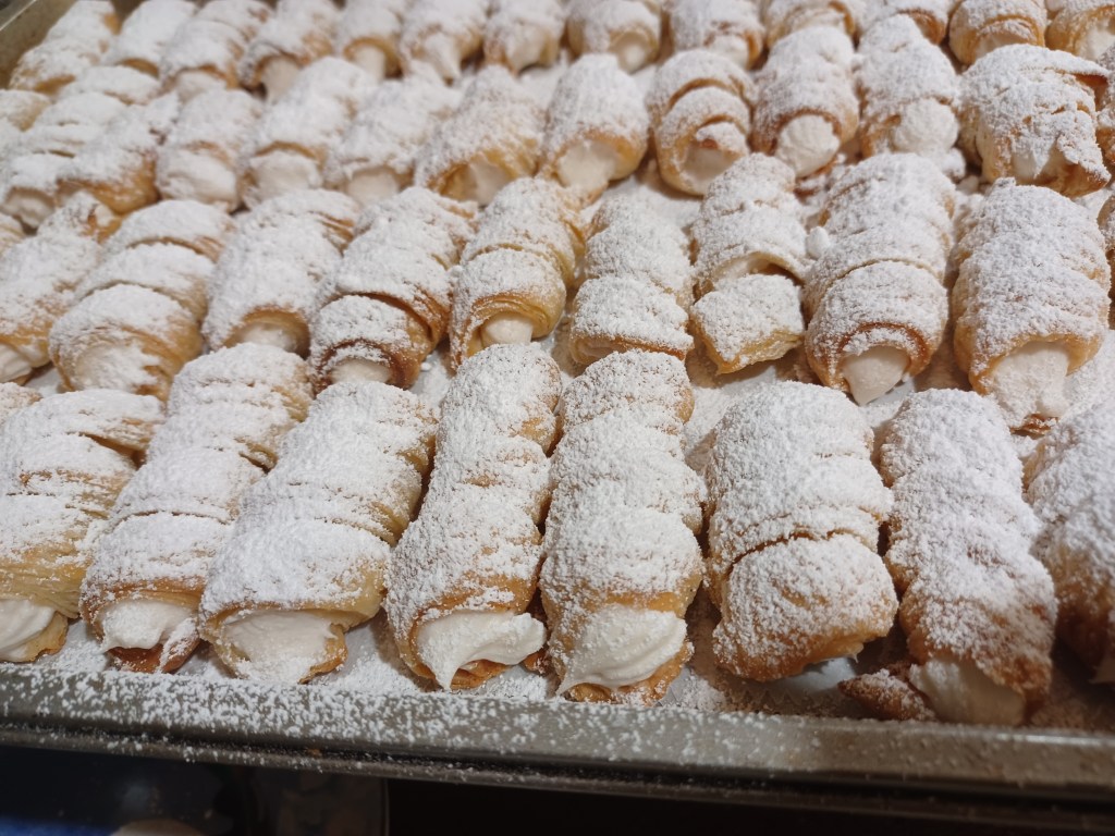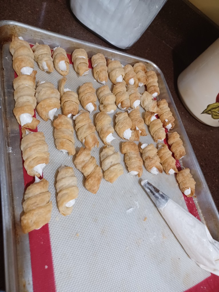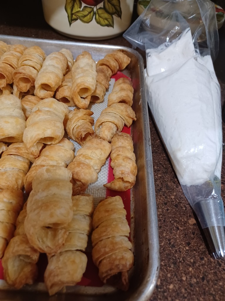 Now put your fluffy filling into a piping bag with a big star tip. Fill the cookie shells by putting the tip into the end of the shell and squeeze. I also turn the little shell around and fill the other side if needed.