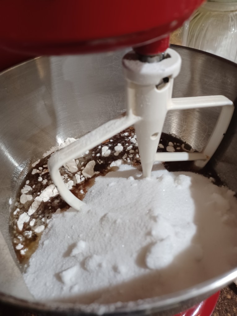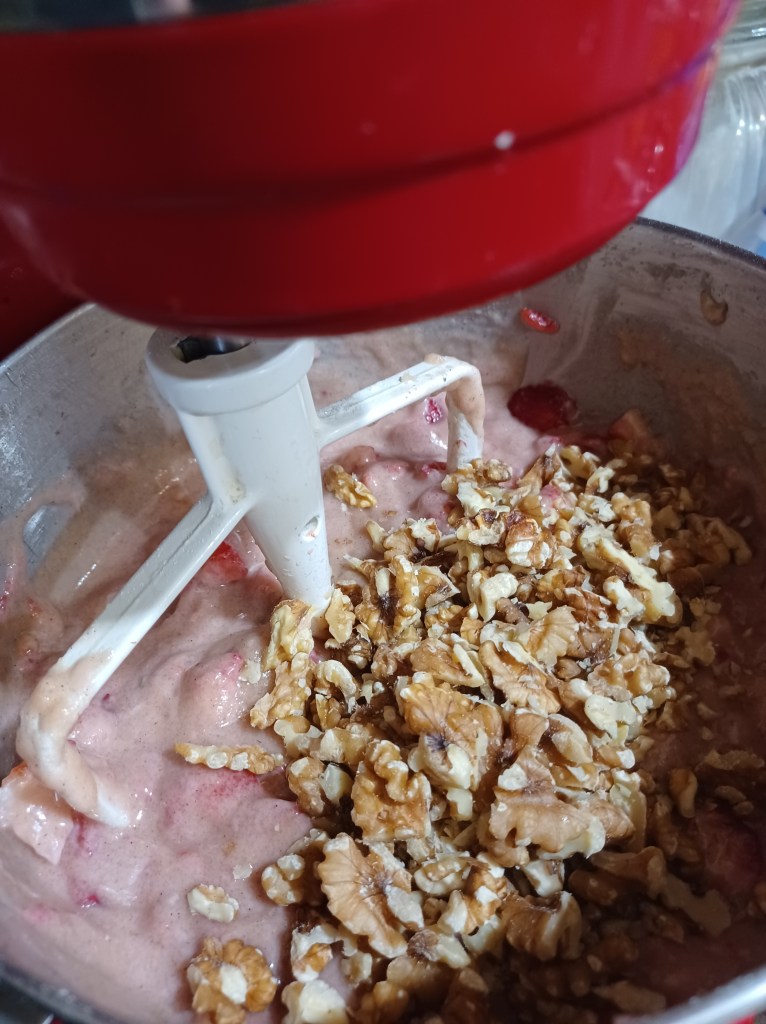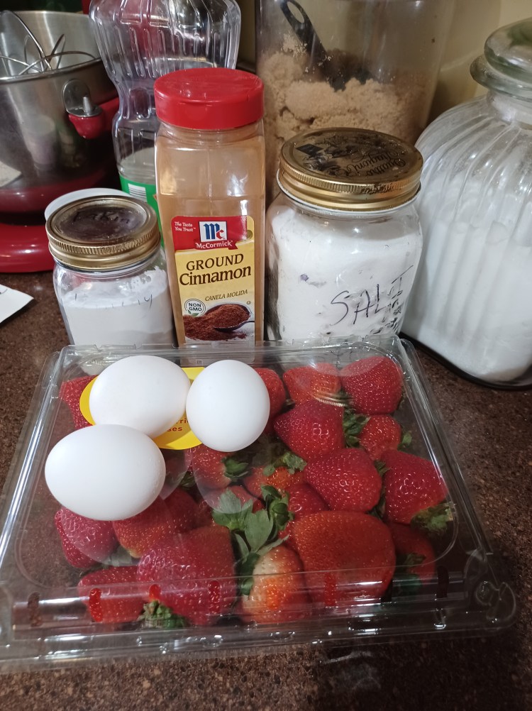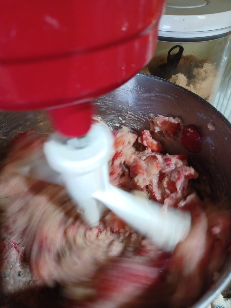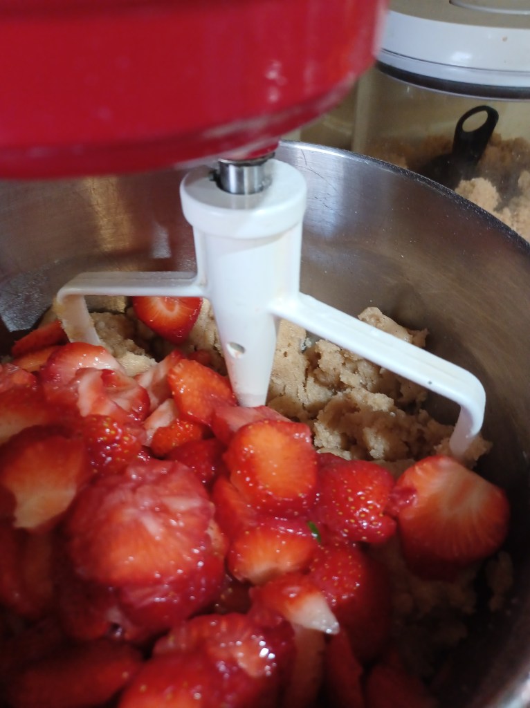 Place oil, flour, baking soda, salt, cinnamon, sugar and eggs into your mixer bowl. Mix till blended. (The batter will seem very thick, don’t worry, when you add the strawberries, it will be right)