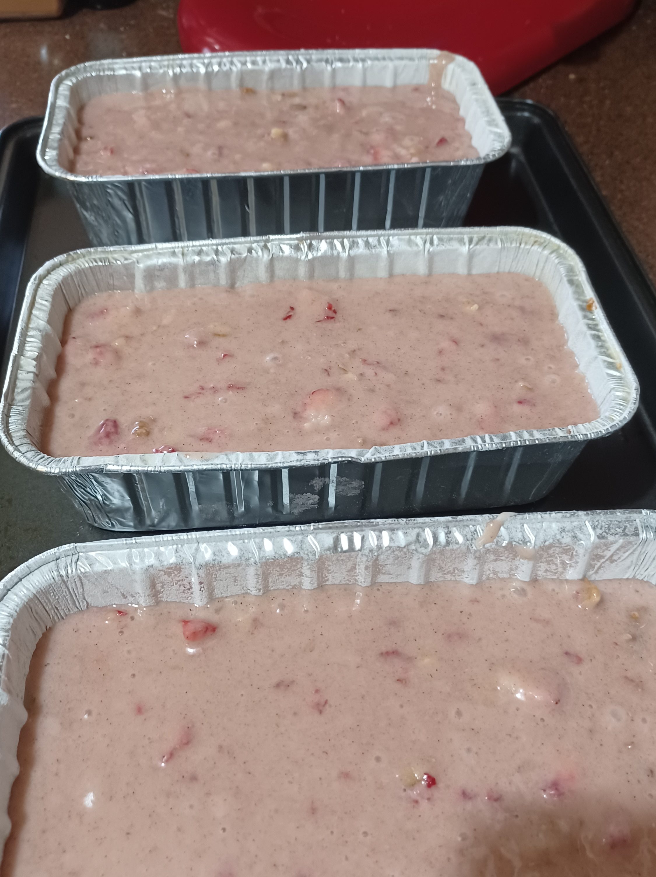 This is strawberry bread. It is so delicious and moist. I got this recipe from my friend years ago and have made it ever since! My customers loved it! My family loves it too! It makes 3 loaves if you use 8 x 3.75 foil pans, which are my favorite pans for sweet breads. I buy them in packs of 3 and always have lots of them for baking. I also have aluminum hard pans of this size but bake mostly in the foil pans. You can wash them and use them many times before you need to replace them.
