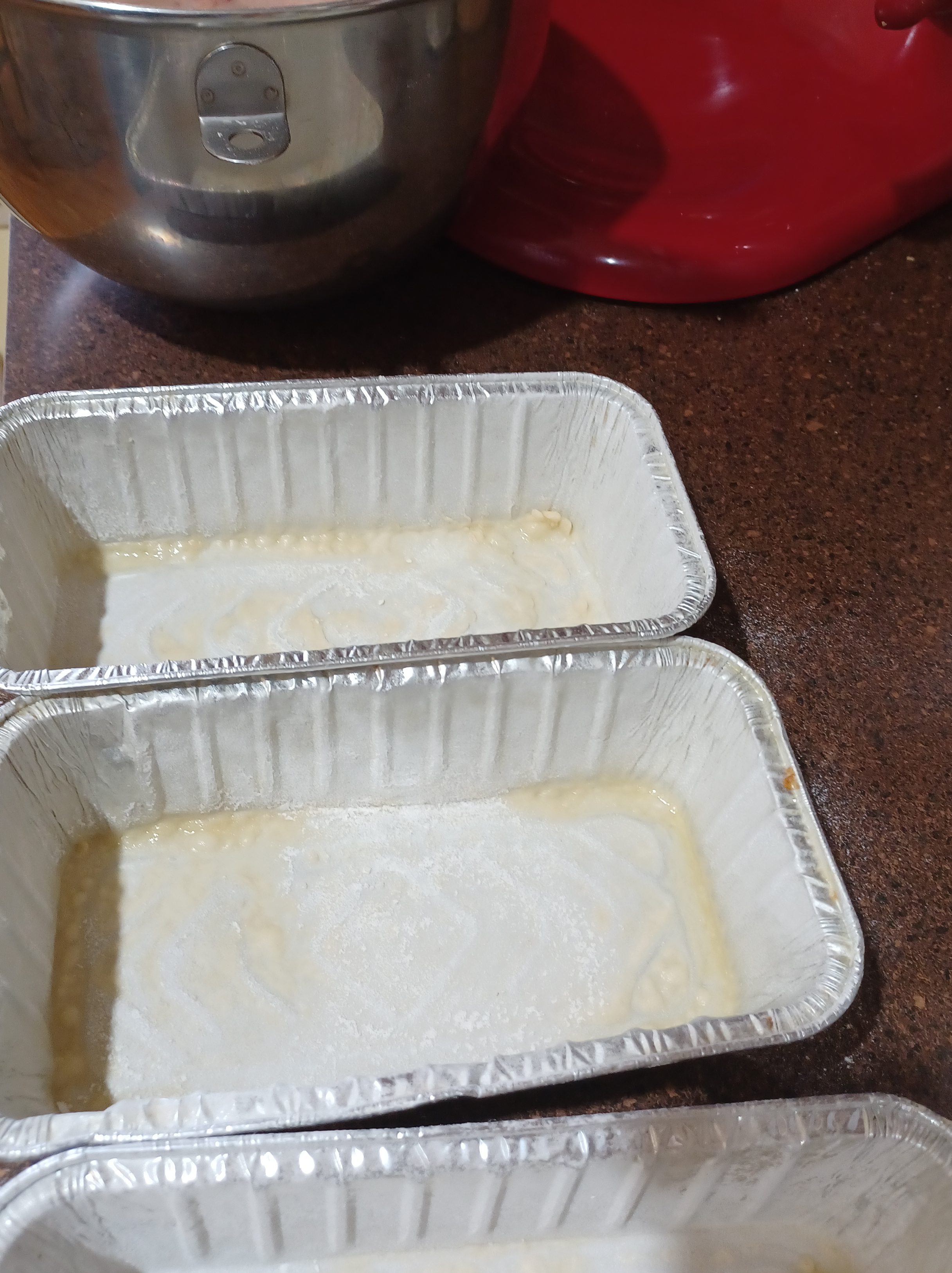 Now prepare your 3 pans. Spray them well with pan spray, then flour them. Set aside