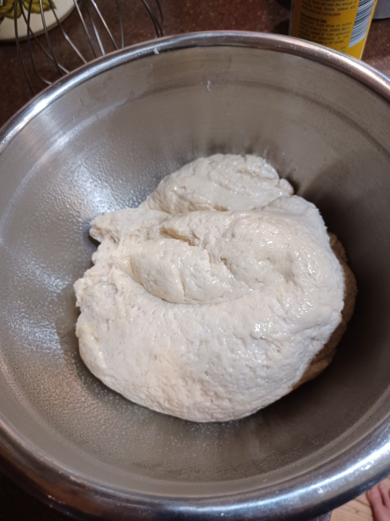 When your dough has formed, place it into a greased bowl (you can use pan spray or oil) Then cover and sit it in a warm place.