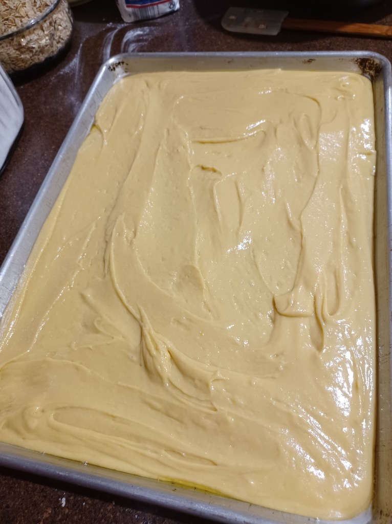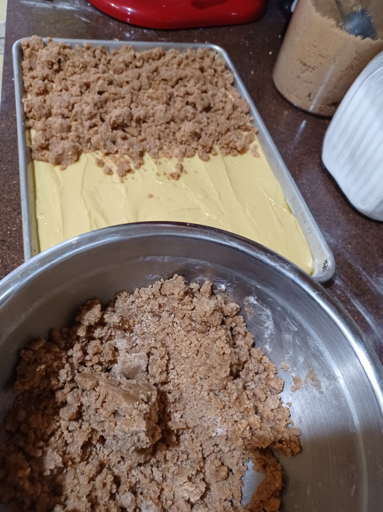 Now place the batter into the sprayed sheet pan. Now using your hands, crumble the topping over the cake batter, using all the crumbs and in a heavy fashion onto the batter.